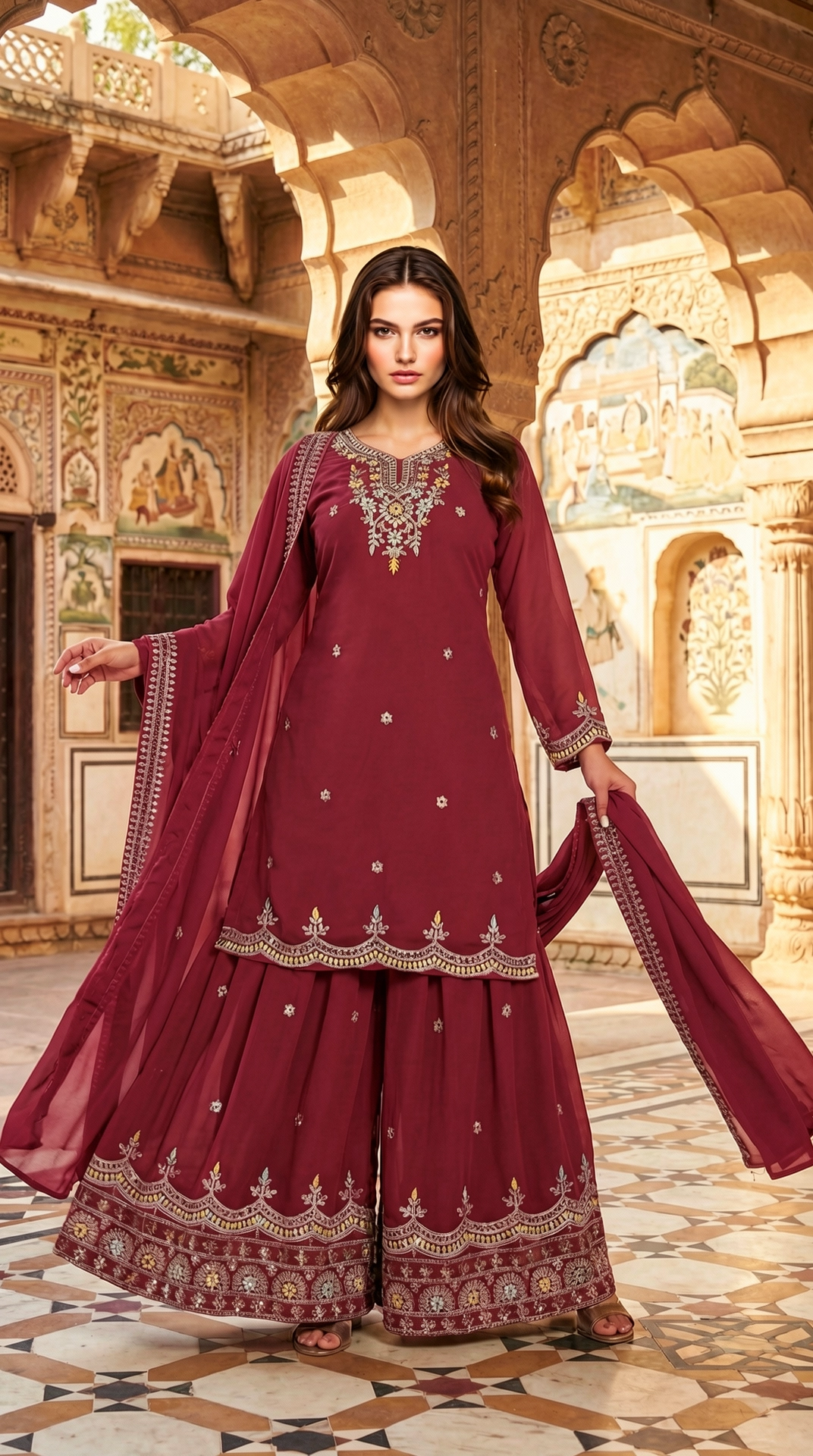 Introducing a graceful wine red kurta sharara set crafted for elegant festive and wedding occasions. The straight-cut kurta is adorned with intricate gold embroidery along the neckline and hem, creating a refined focal point against the rich hue. Paired with a flared sharara featuring delicately embroidered motifs and a beautifully bordered hem, and complemented by a sheer matching dupatta finished with an ornate trim, this ensemble exudes timeless sophistication. Perfect for weddings, festive gatherings, and celebratory evenings, it blends classic craftsmanship with contemporary charm.