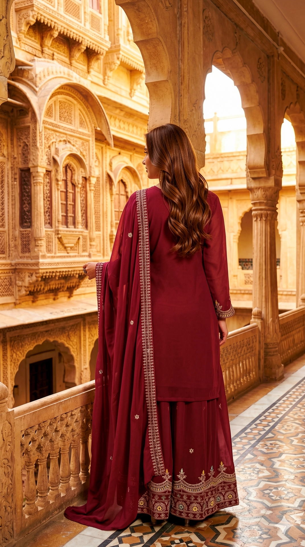 Style with statement gold or kundan jewelry and metallic heels for a polished festive look. Opt for soft waves and warm-toned makeup to enhance the richness of the wine red shade.