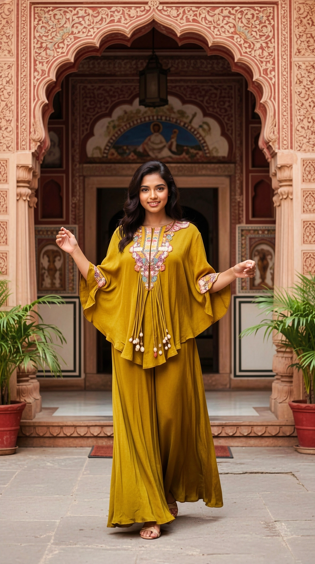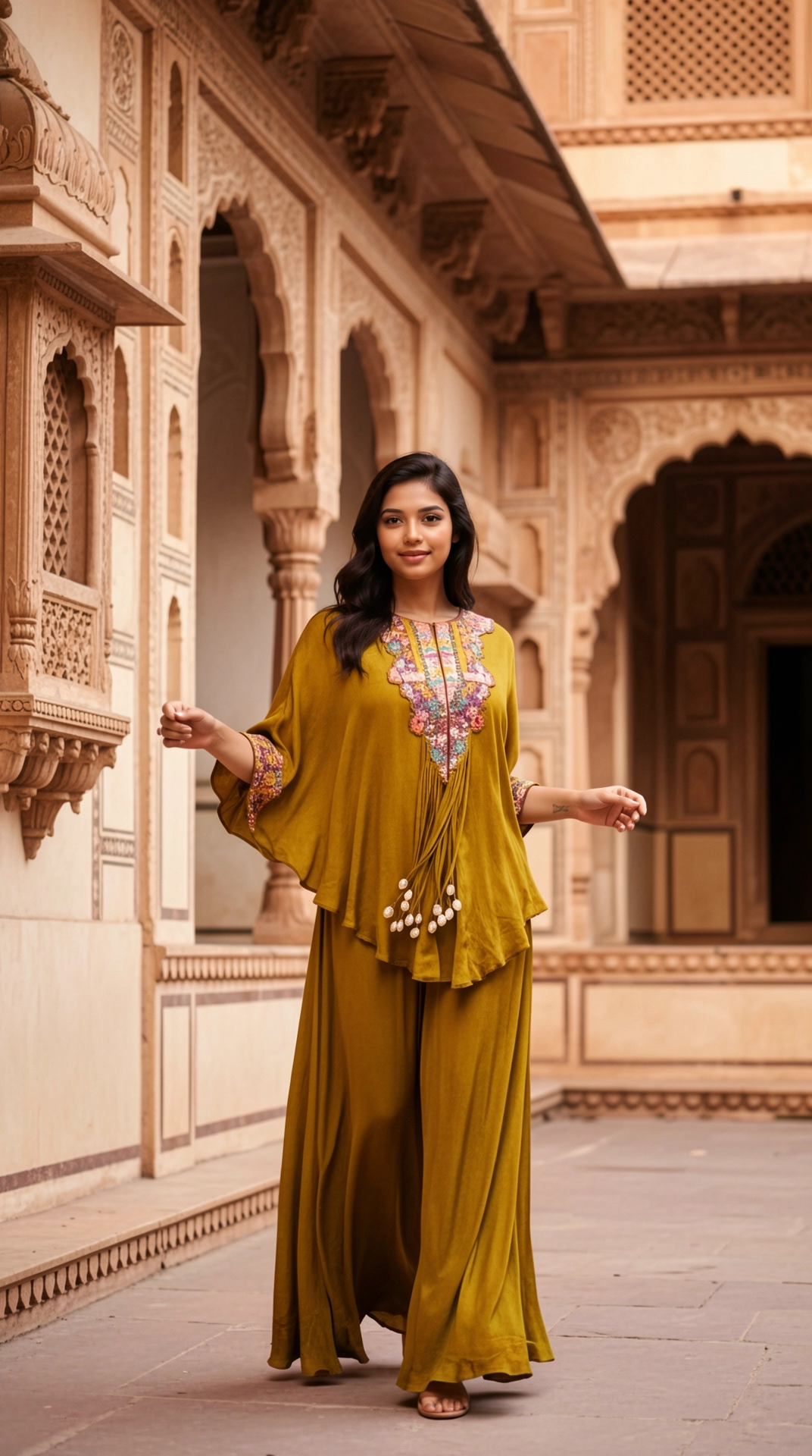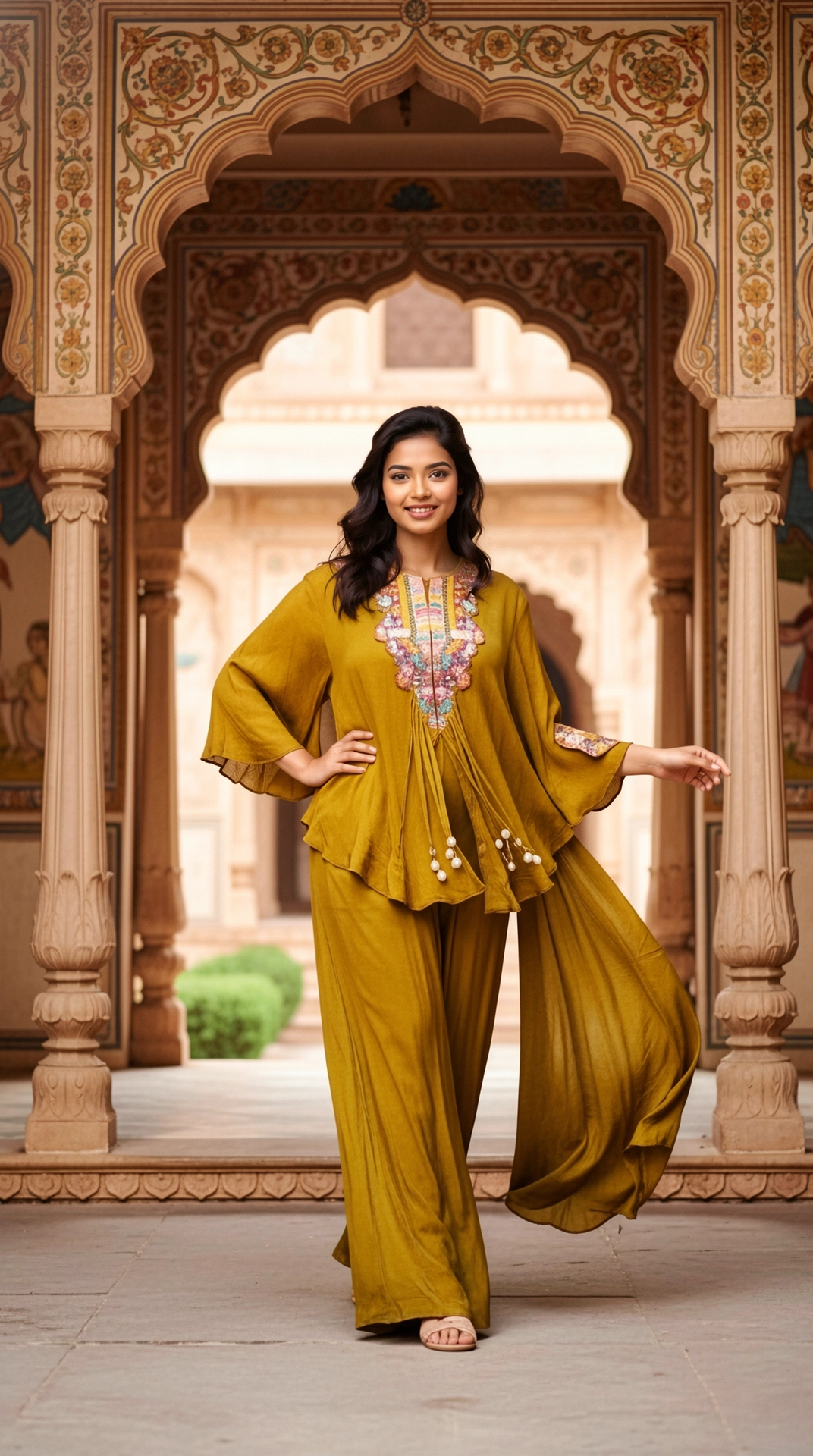 Style with minimal jewellery, statement earrings, comfortable flats or sandals, loose waves or ponytail, and fresh makeup for effortless elegance.