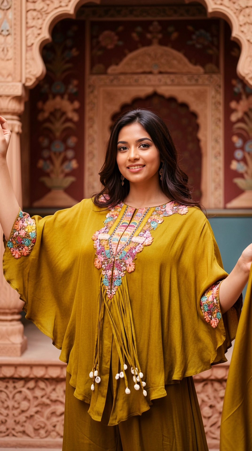 This chinon kurta set features intricate embroidery and subtle sequin detailing, creating a relaxed yet elegant silhouette. Designed with a flowing kurta and coordinated bottoms, it offers comfort, fluid movement, and artisanal charm, making it ideal for casual festivities, daytime celebrations, and contemporary ethnic styling.