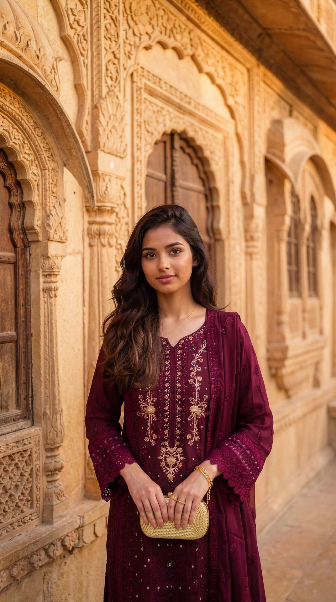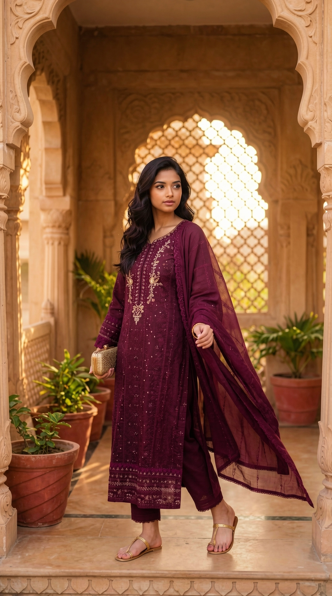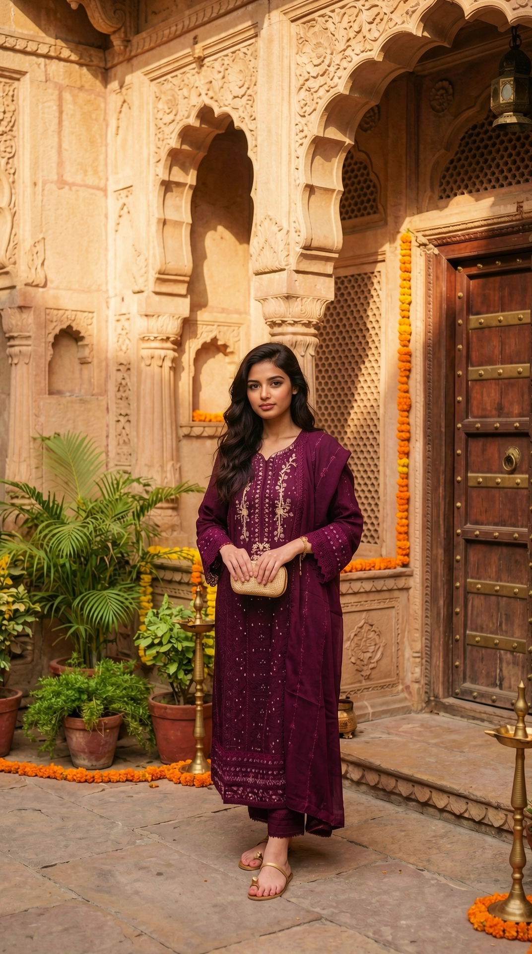 This wine georgette kurta set features intricate embroidery with subtle sequin detailing, creating a rich and graceful silhouette. Designed with a straight-cut kurta, coordinated bottoms, and a matching dupatta, it offers refined craftsmanship, fluid drape, and timeless elegance, making it ideal for festive celebrations, evening gatherings, and wedding occasions.