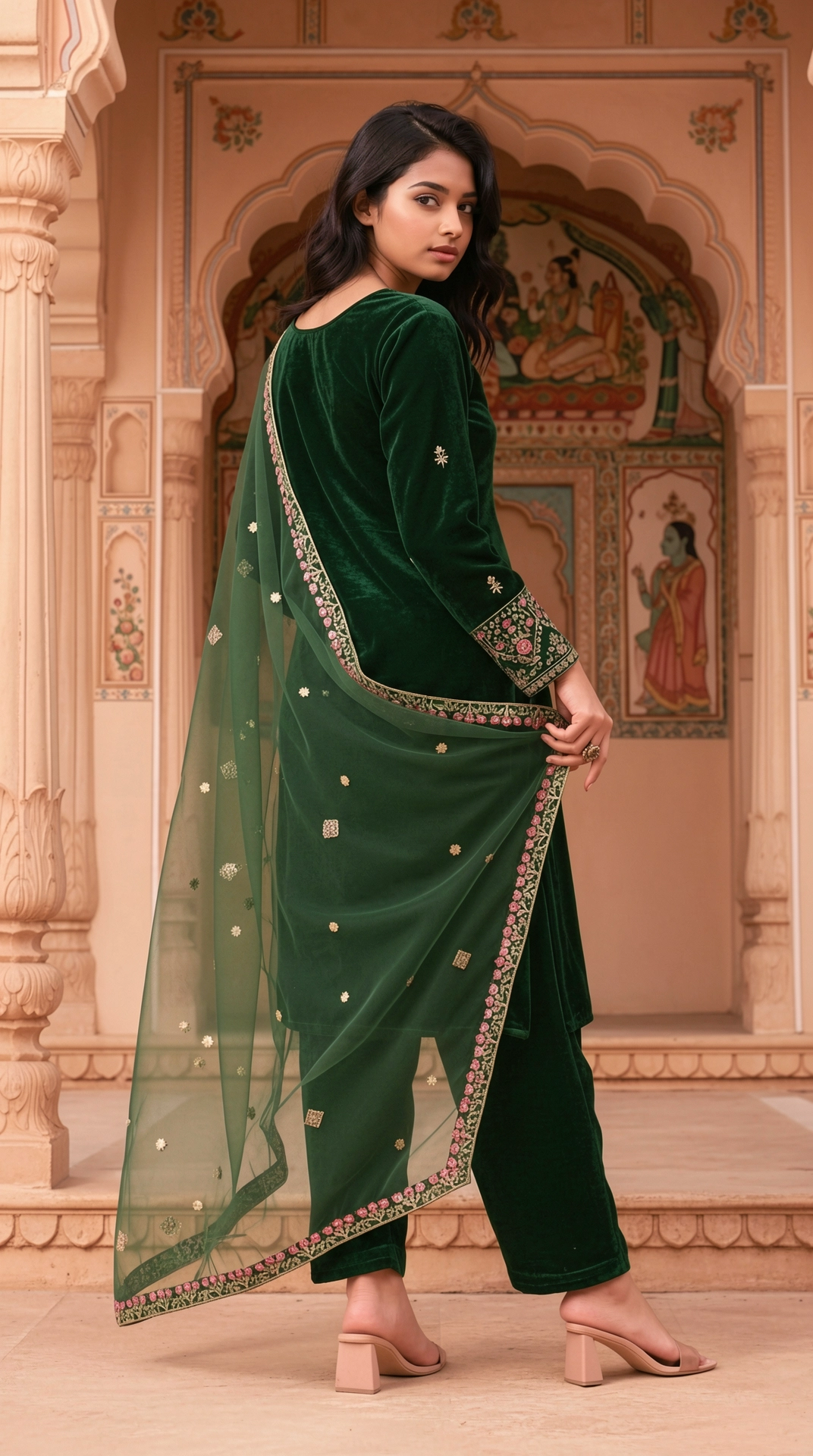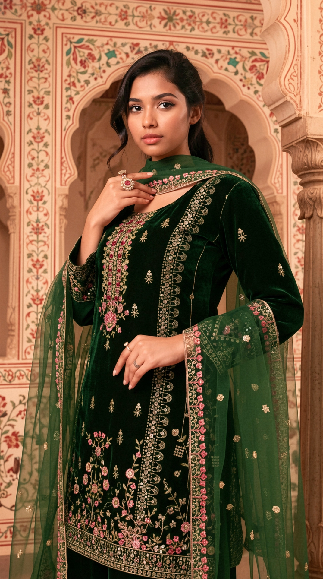 Style this emerald green velvet salwar suit with antique gold or kundan jewelry such as statement jhumkas or a delicate choker to complement the Gota Patti and floral embroidery. Pair it with embellished heels or classic mojaris in gold or nude tones for an elegant festive look. Complete the ensemble with a gold, champagne, or soft pink embroidered clutch or potli to harmonize with the dupatta and elevate the outfit for weddings and evening celebrations.