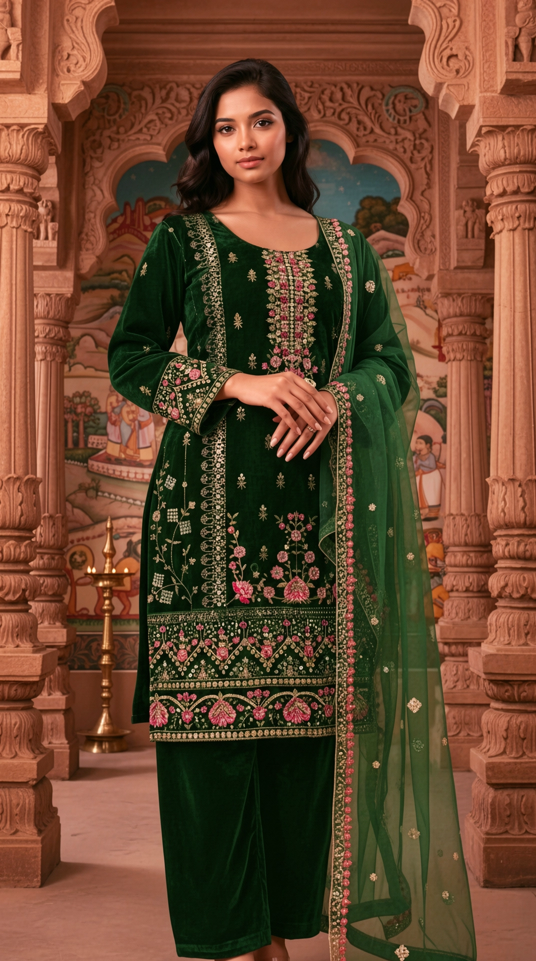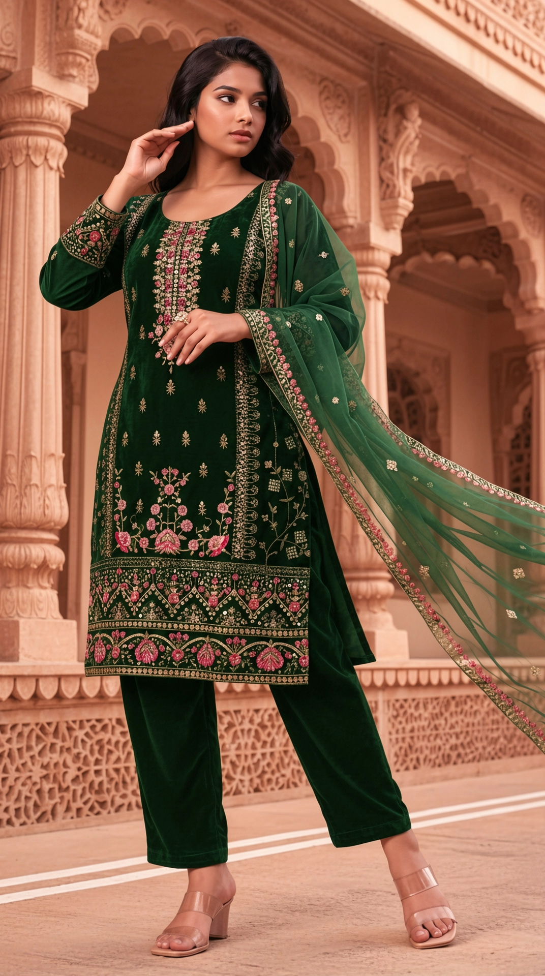Women Velvet Emerald Green Embroidery Sequence Work Kurta set
