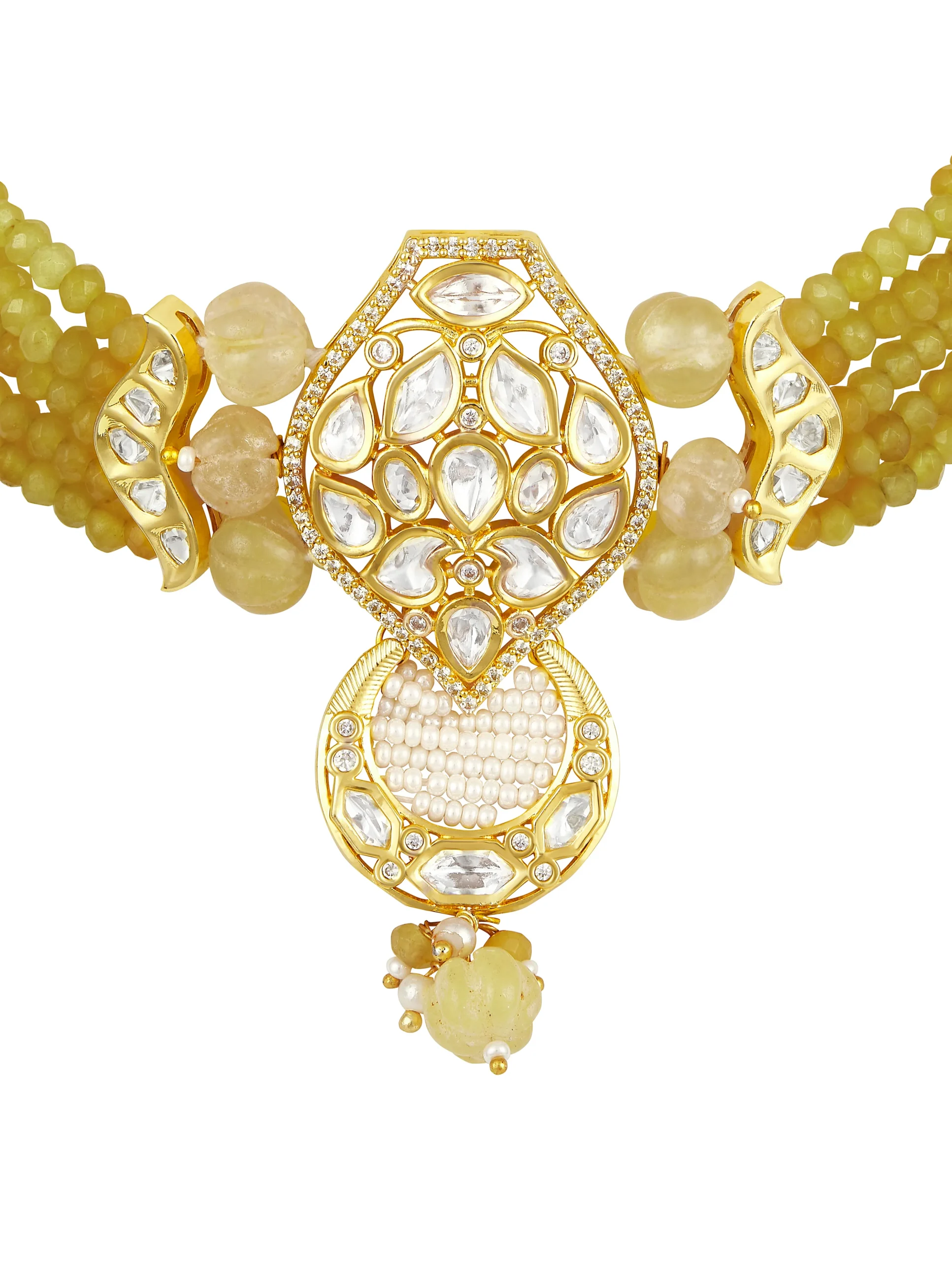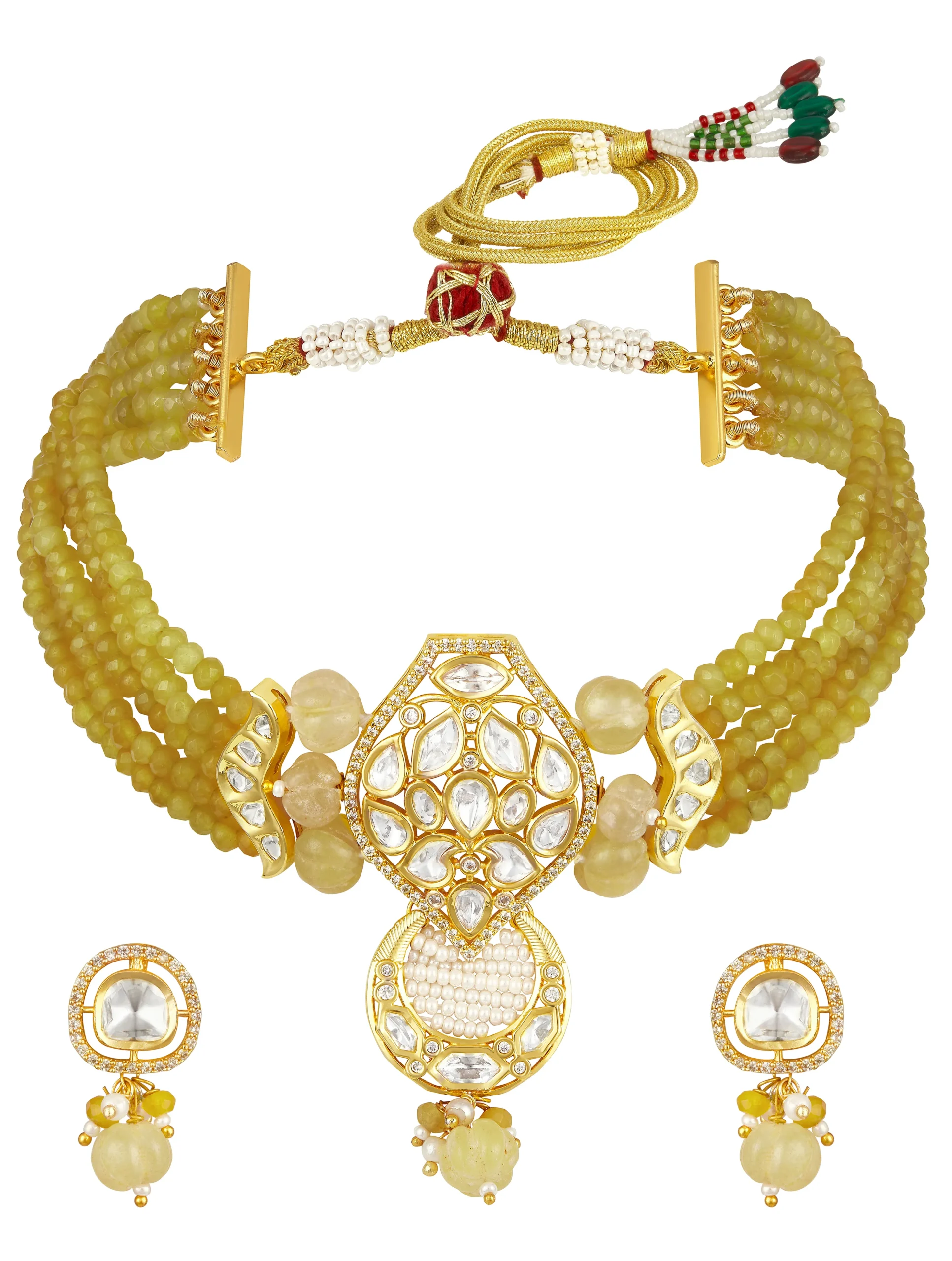 Introducing Yellow Agate Kundan Polki Choker Set with Carved Onyx and Zirconia Gold Finish, a luxurious handcrafted design in micron gold polished brass. Featuring shimmering moissanite kundan polki, vibrant yellow agate strands, pale yellow carved onyx tumbles, and sparkling zirconia accents, this elegant set adds regal charm to weddings and festive occasions.
