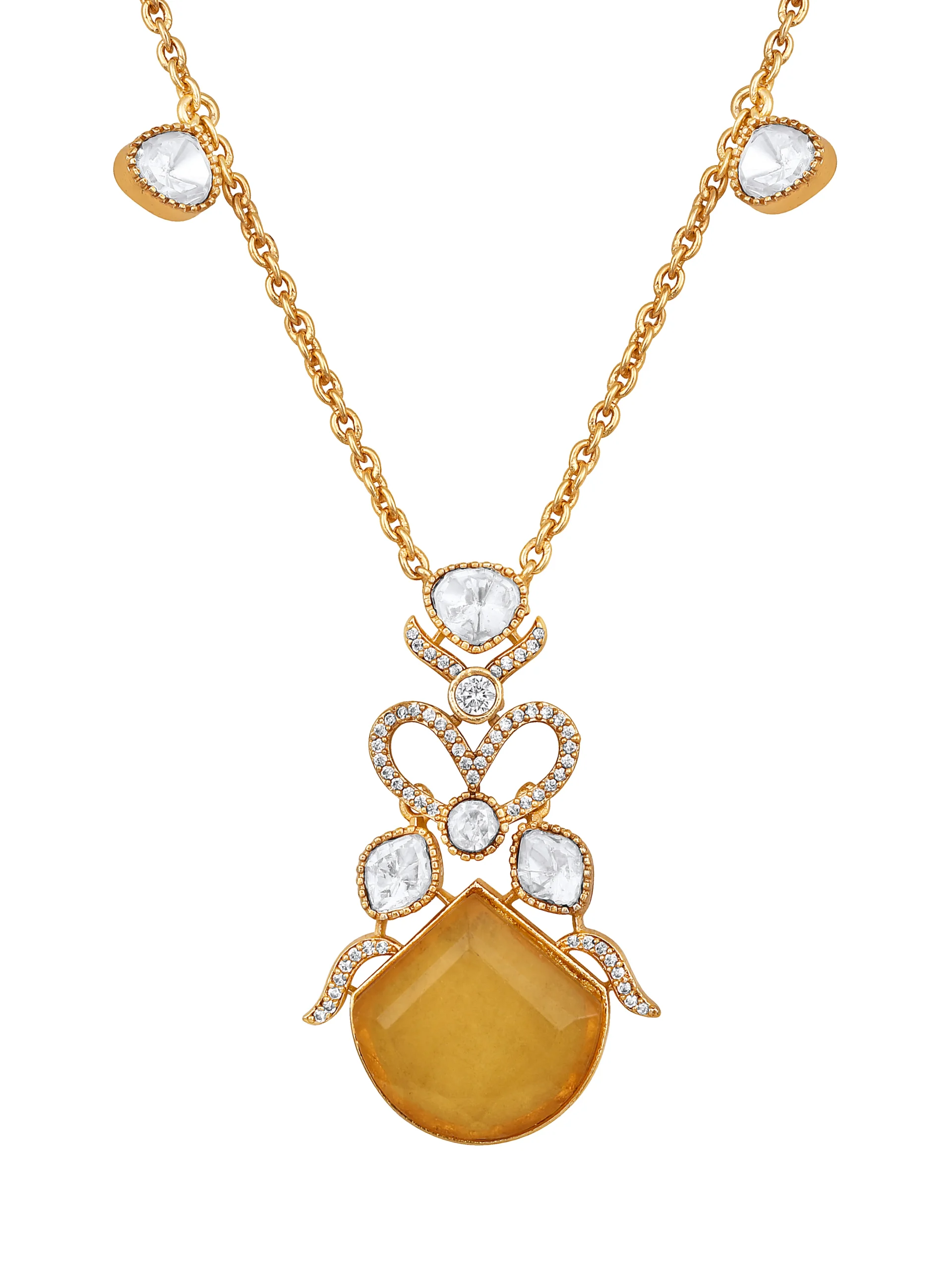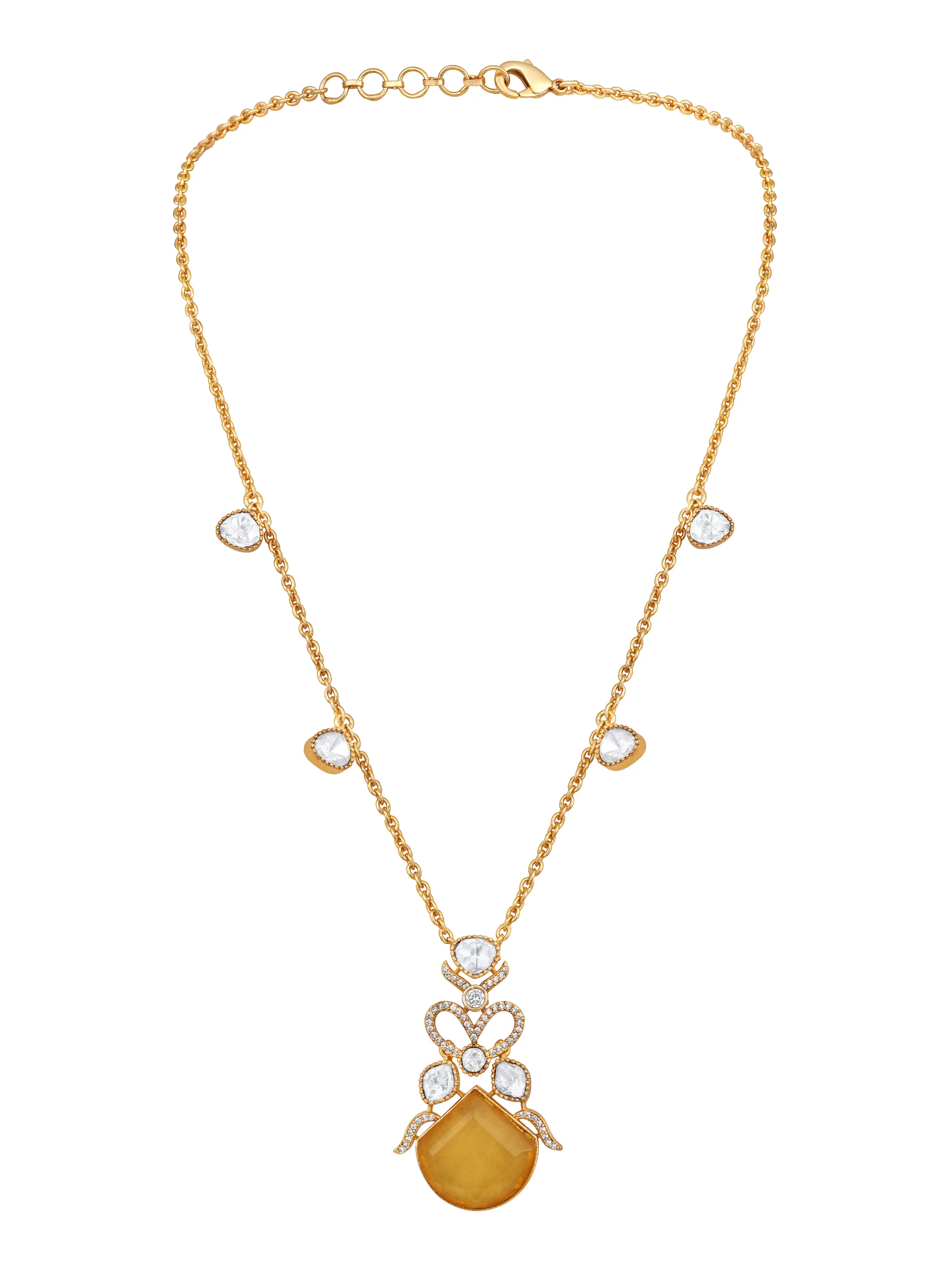 Yellow Agate Kundan Polki Pendant Long Necklace Set in Micron Gold Brass