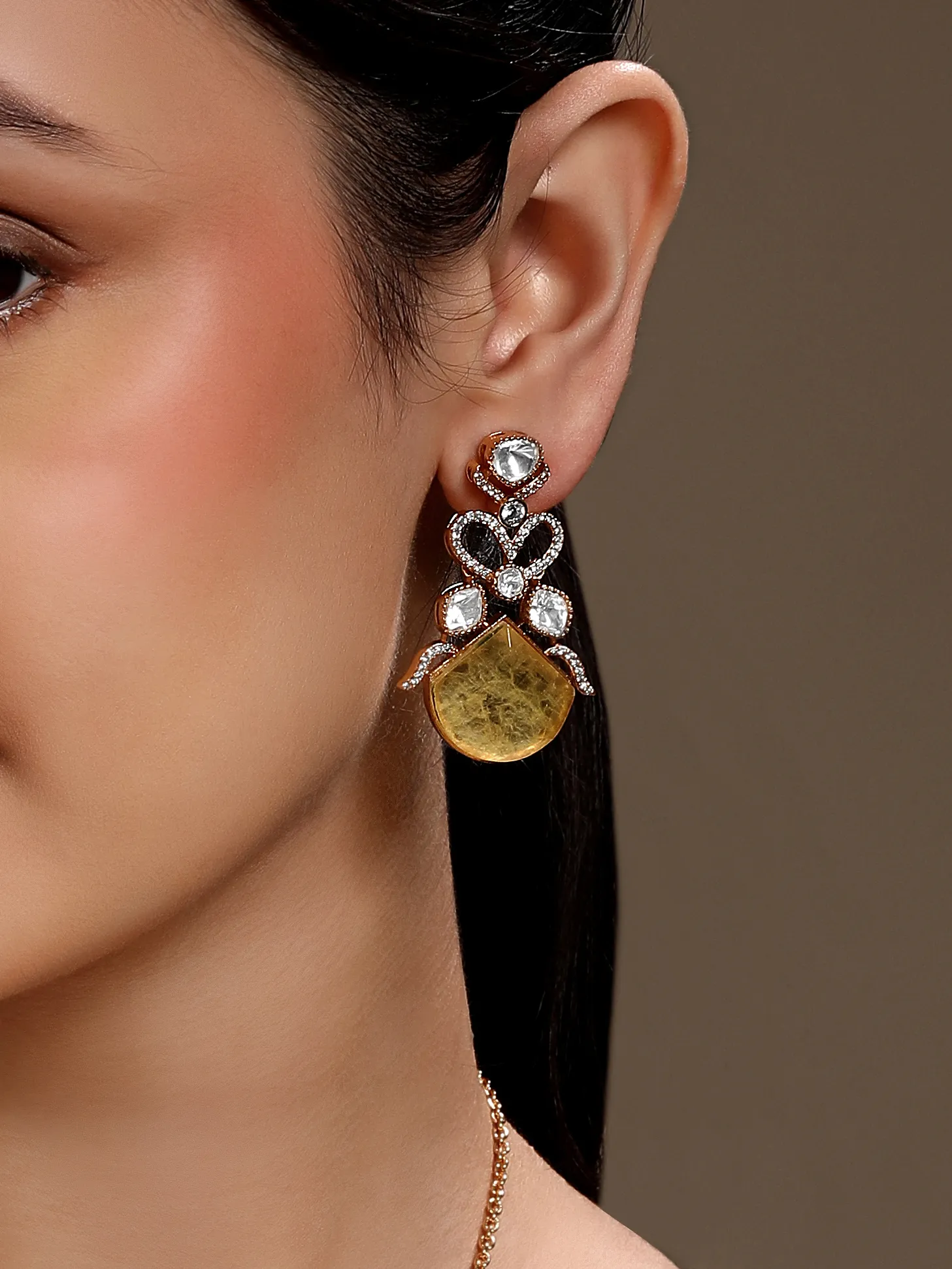 Style this elegant long necklace set with V-neck kurtas, silk sarees, or festive anarkalis to highlight the statement pendant. The warm yellow agate pairs beautifully with neutral, ivory, or pastel outfits. It also complements Indo-western dresses and fusion ensembles for festive gatherings or evening occasions.