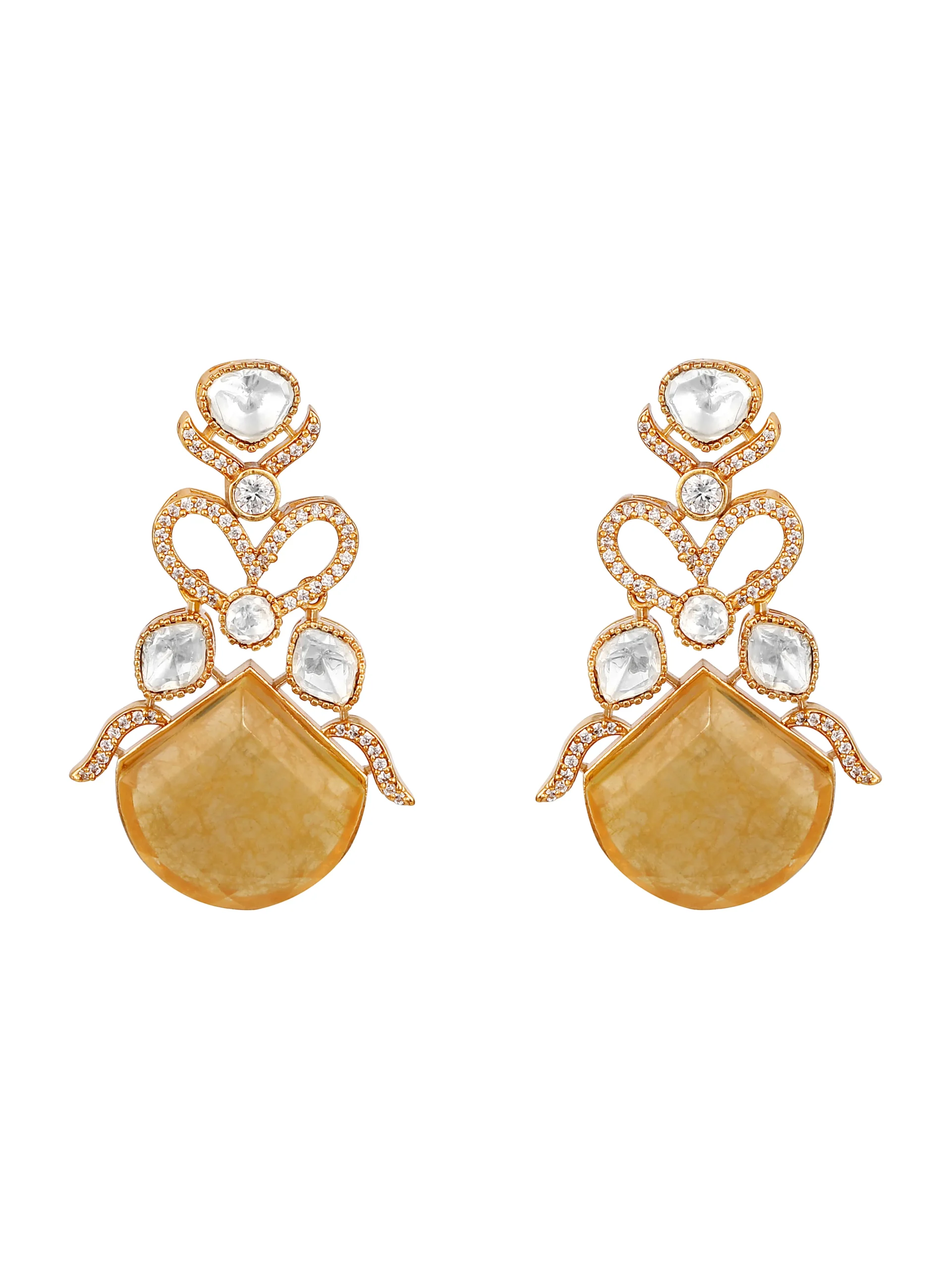 Introducing Yellow Agate Kundan Polki Pendant Long Necklace Set crafted in micron gold polished brass, featuring delicate kundan polki motifs and a radiant yellow agate pendant with pearl accents. Handcrafted with intricate detailing, this elegant necklace set blends timeless tradition with modern charm for festive, ethnic, and Indo-western styling.