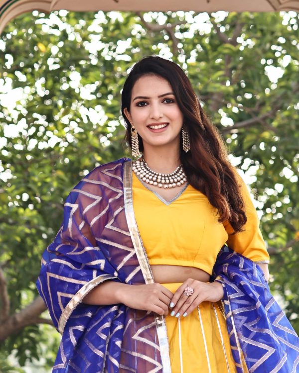 Introducing a yellow and blue cotton silk lehenga set featuring a yellow cotton silk blouse with unique back detailing, paired with a flared lehenga finished with gota and zari lappa borders, complemented by a contrast blue zari-woven organza dupatta with gota border.