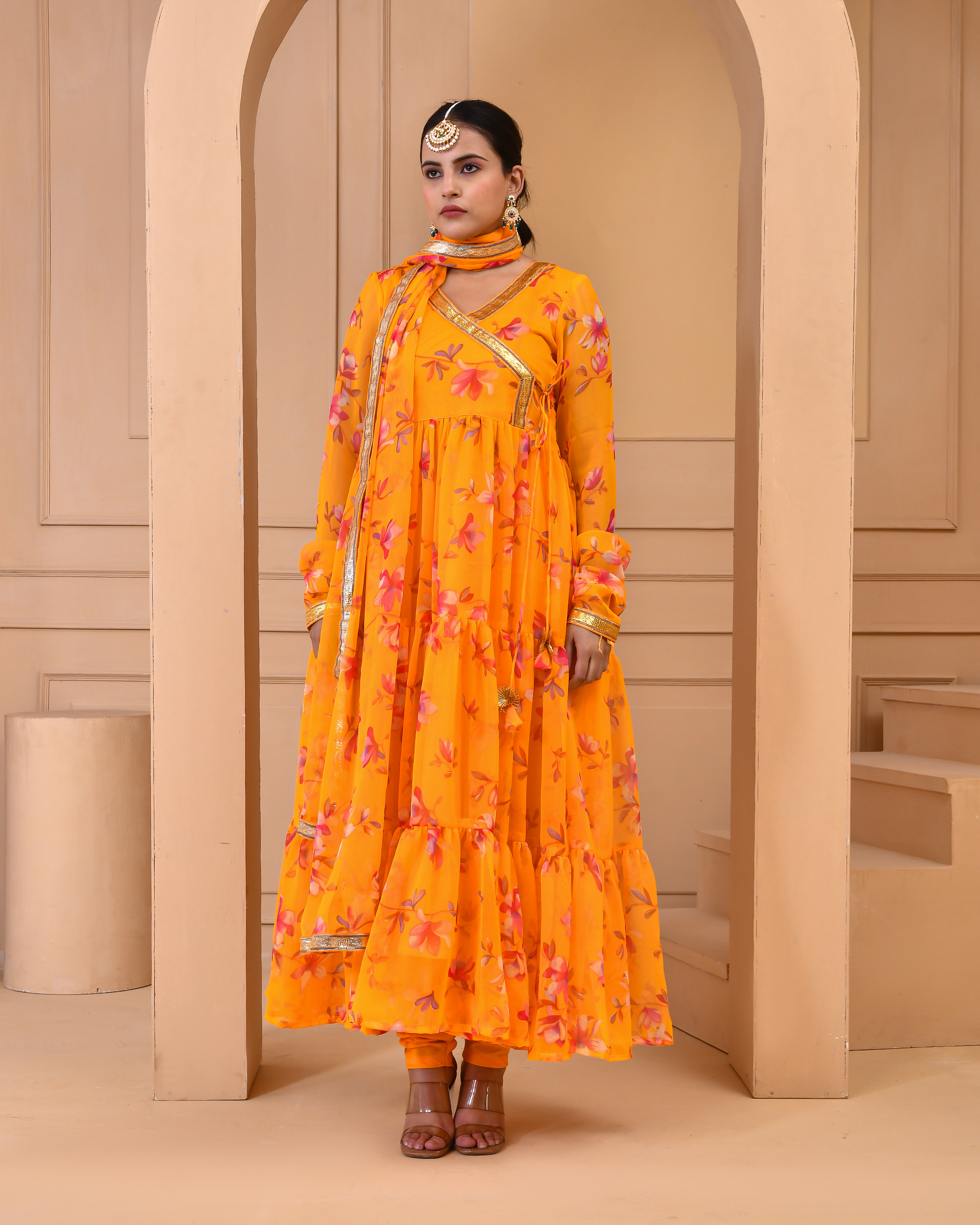 Introducing a yellow chiffon floral print anarkali set. Designed in lightweight chiffon, the floor-length anarkali features an all-over floral print with subtle gota detailing and an angrakha-style silhouette, paired with a yellow solid churidar and a matching floral print dupatta finished with gota accents.