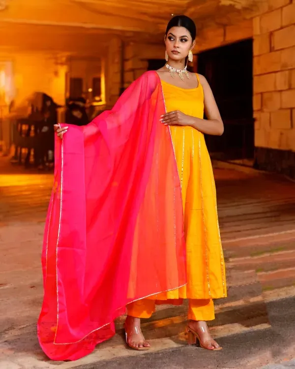 Introducing a bright and graceful yellow cotton silk suit set designed to celebrate festive elegance with a contemporary touch. The flowing Anarkali kurta, crafted in soft cotton silk, features refined gota work detailing that adds subtle festive shimmer while maintaining an effortless silhouette. Perfect for festive gatherings, this ensemble blends traditional craftsmanship with modern sophistication.