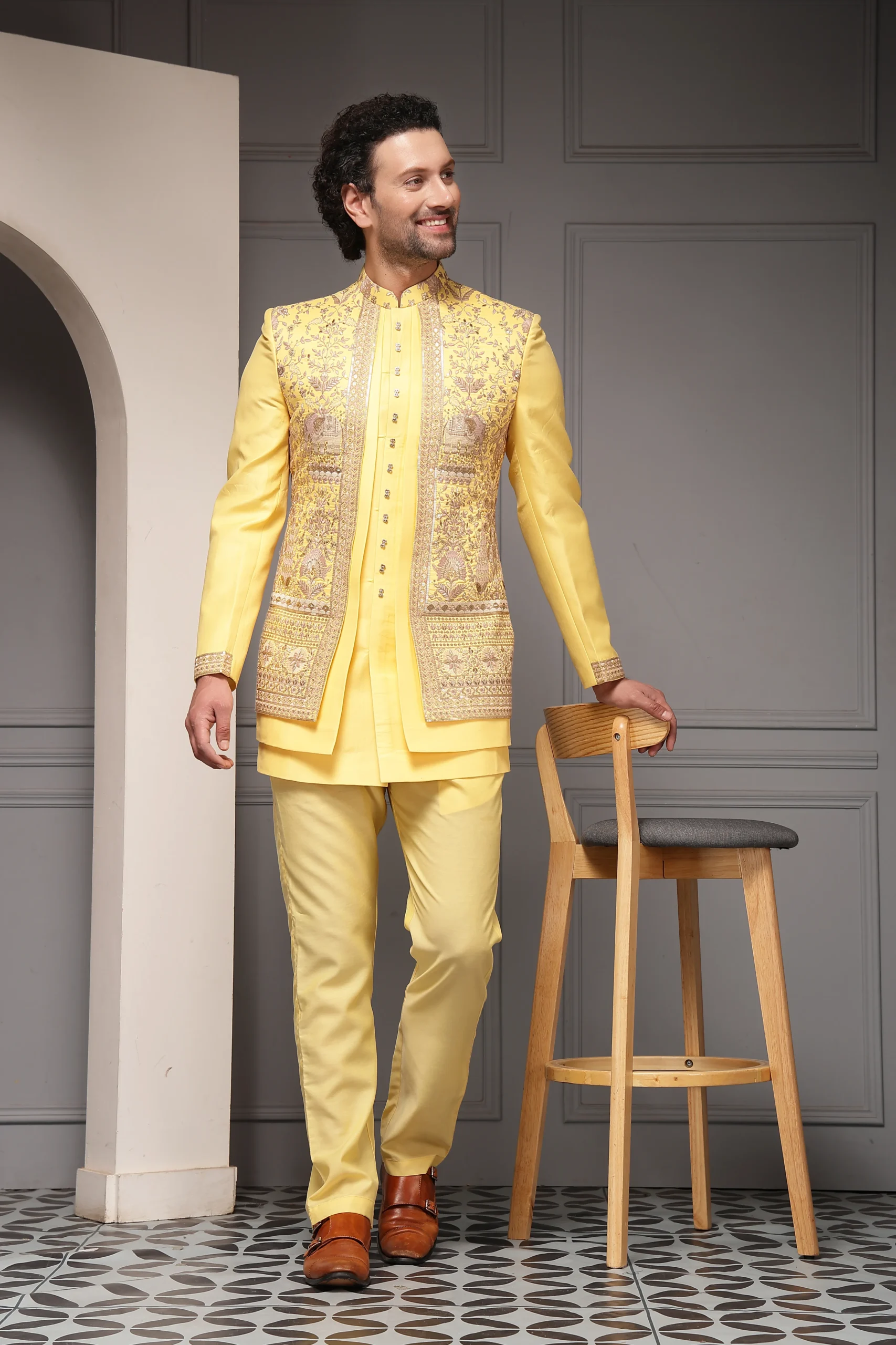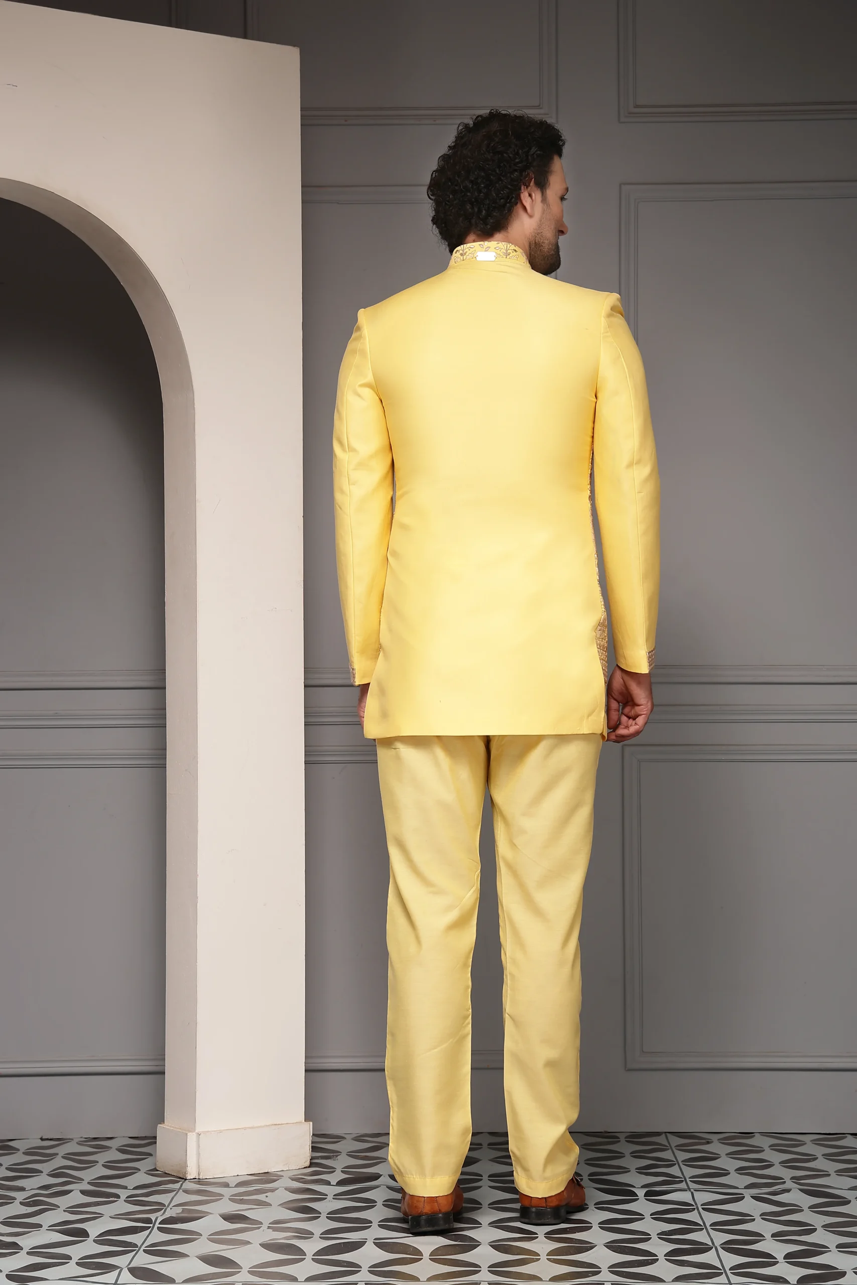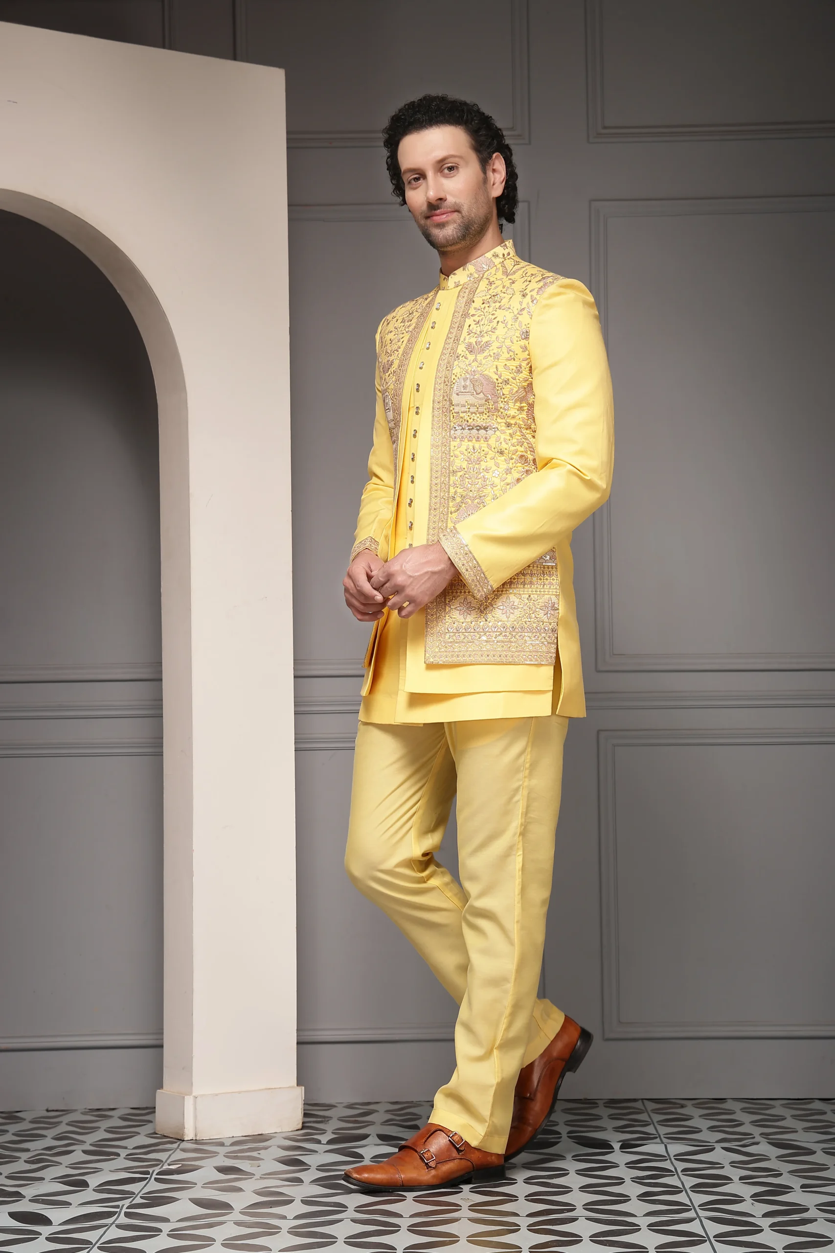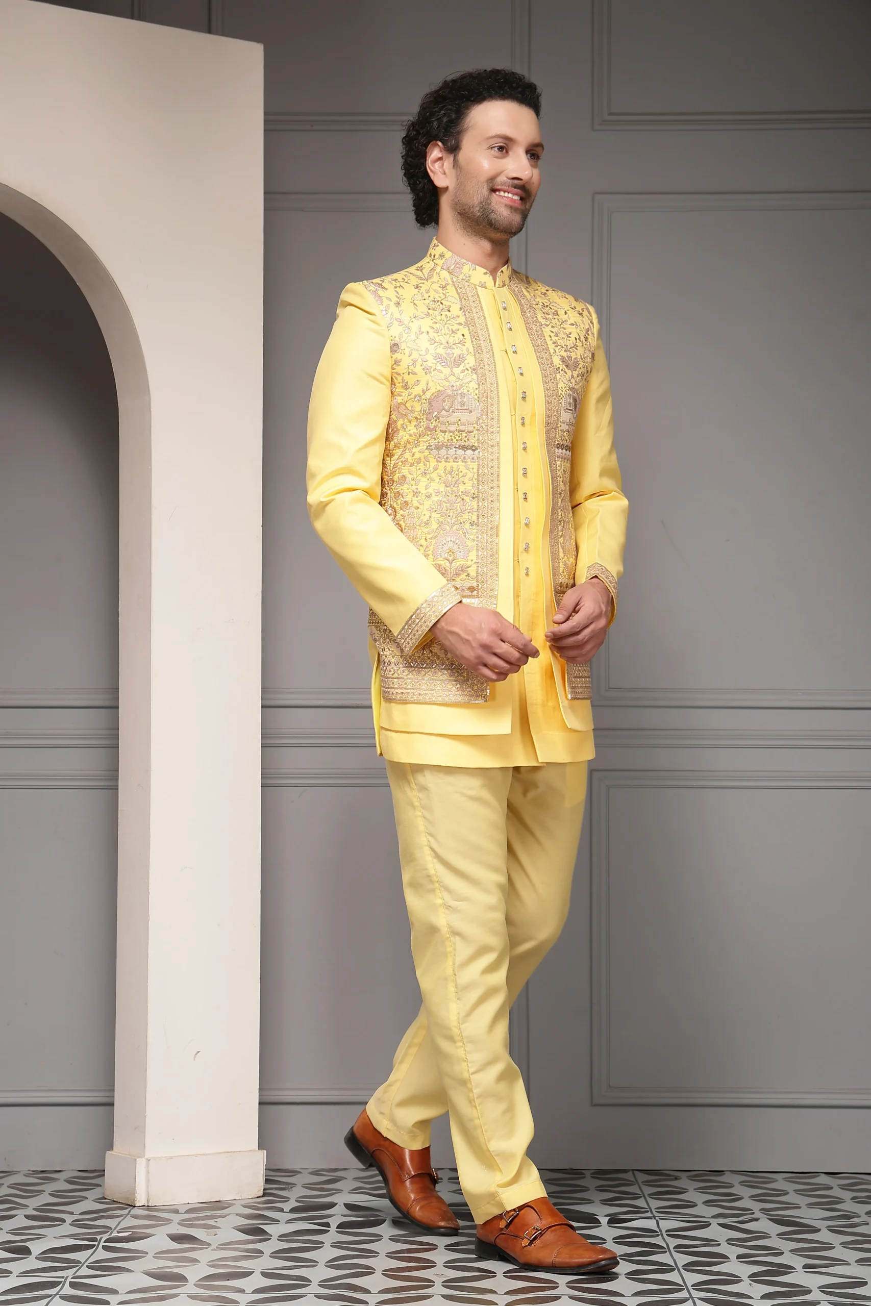 Introducing a radiant yellow bandhgala set crafted to celebrate joy and festive elegance. The bandhgala jacket in premium silk-blend jacquard features intricate all-over heritage embroidery inspired by royal motifs, highlighted with antique gold and multicolour thread work. Paired with a refined inner kurta and tailored trousers in fine suiting fabric, and finished with a soft poly-viscose lining, this vibrant ensemble is perfect for haldi ceremonies, festive weddings, and daytime celebrations.