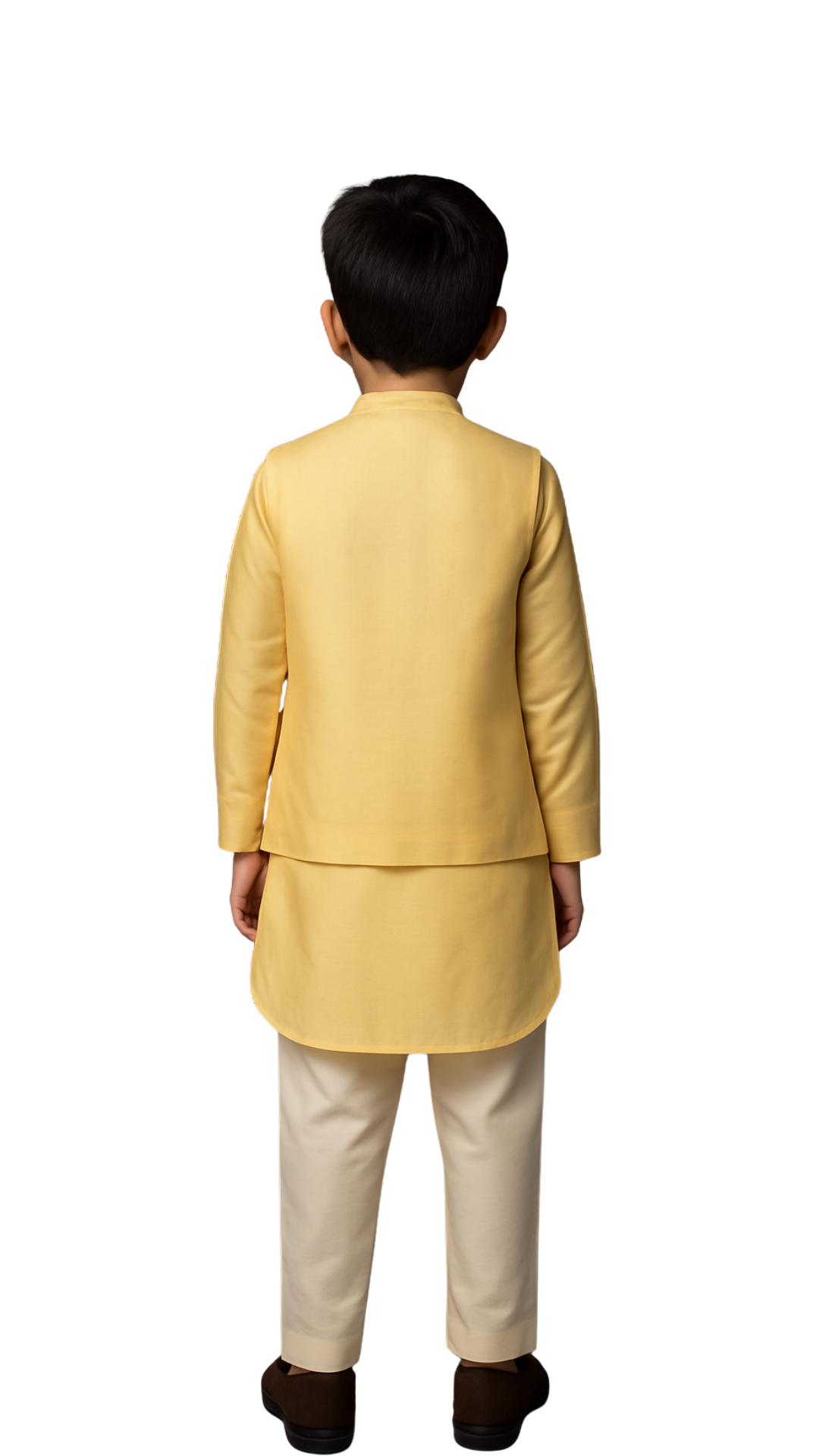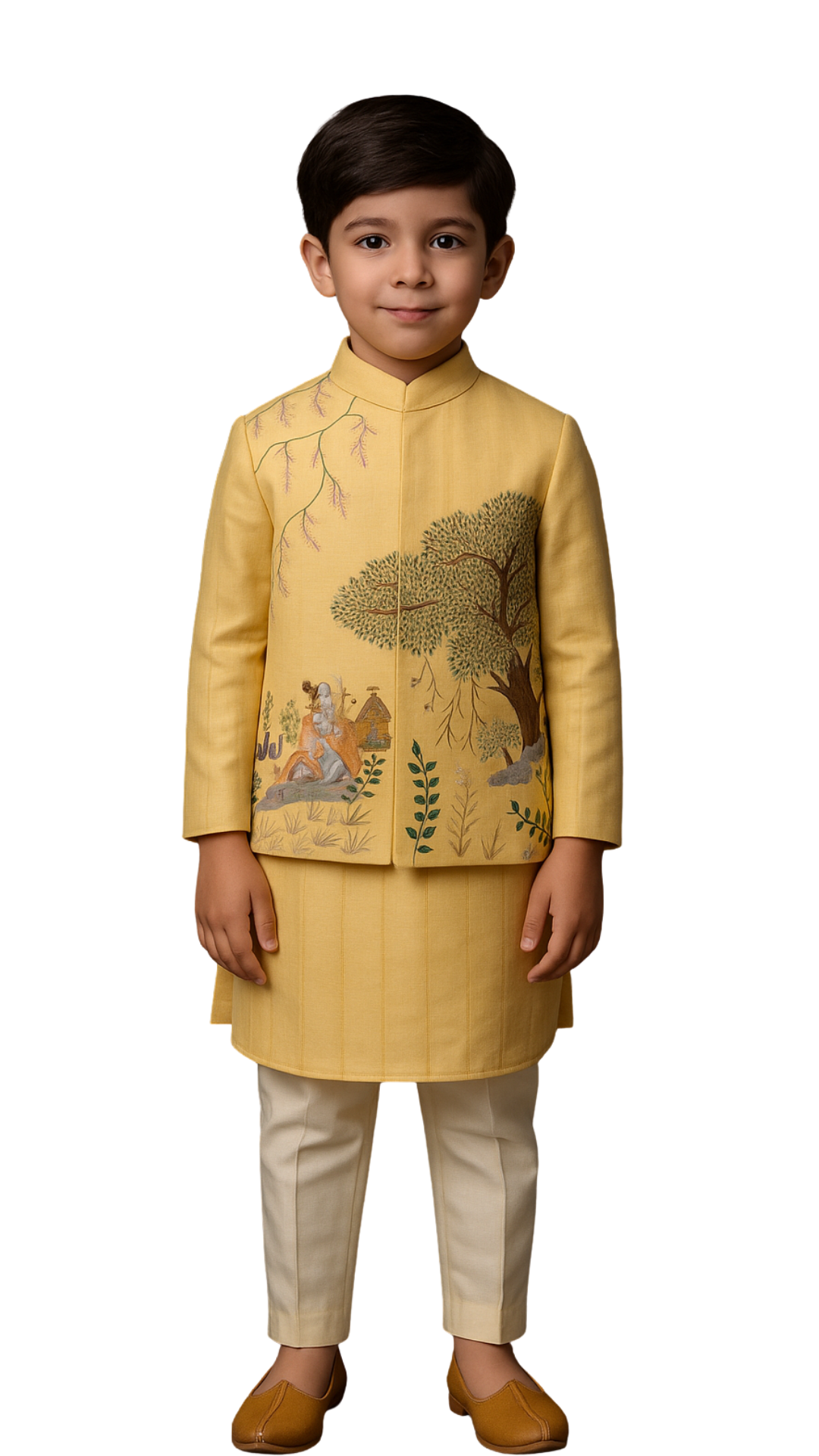 Introducing a yellow nehru jacket in luxurious bamberg silk, featuring a hand-painted tableau of Lord Shiva beneath the Kalpavriksha tree, symbolizing divinity and serenity. Paired with a matching yellow bamberg silk kurta and ivory cotton pants, this ensemble is perfect for traditional ceremonies, religious occasions, and sacred festive moments.