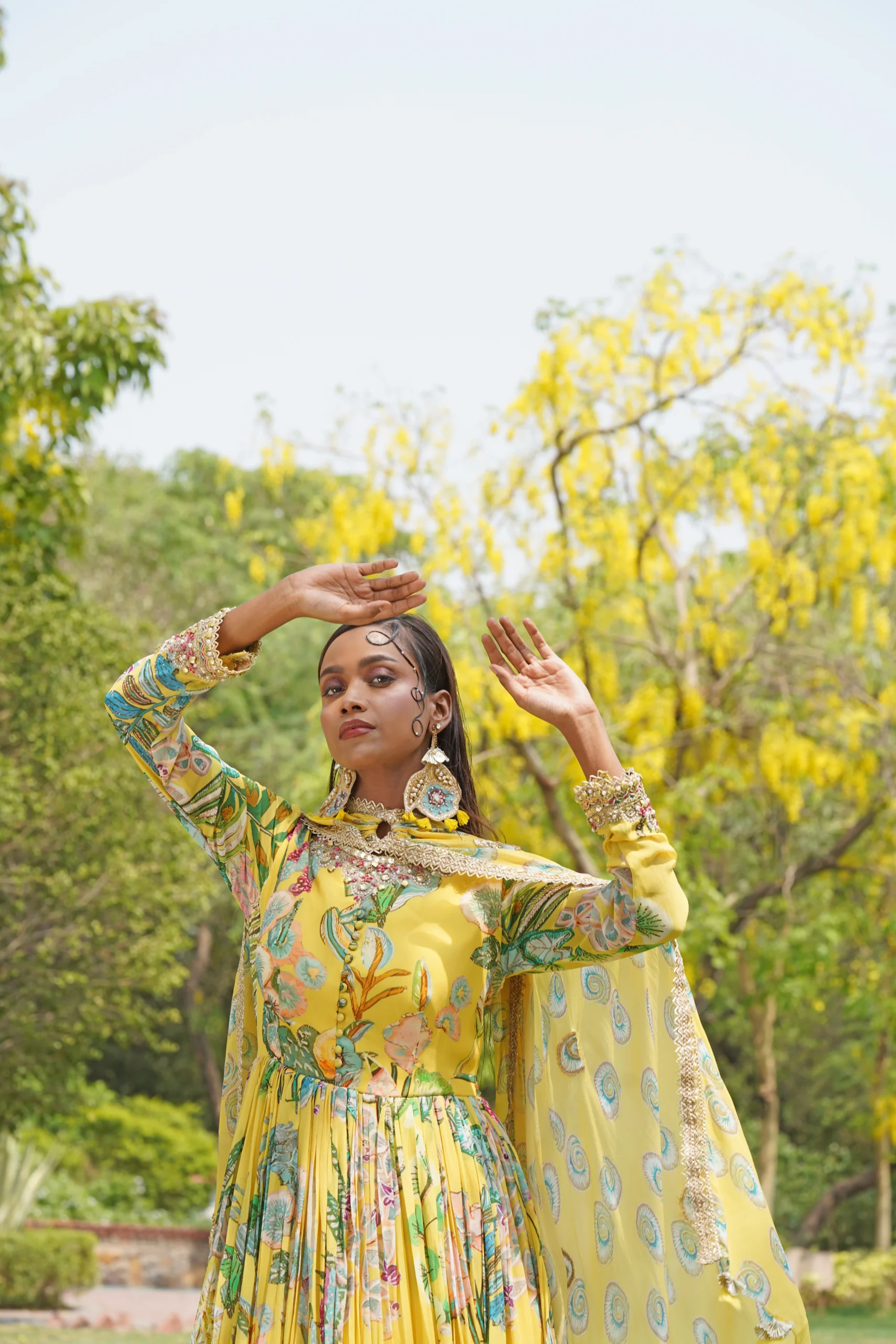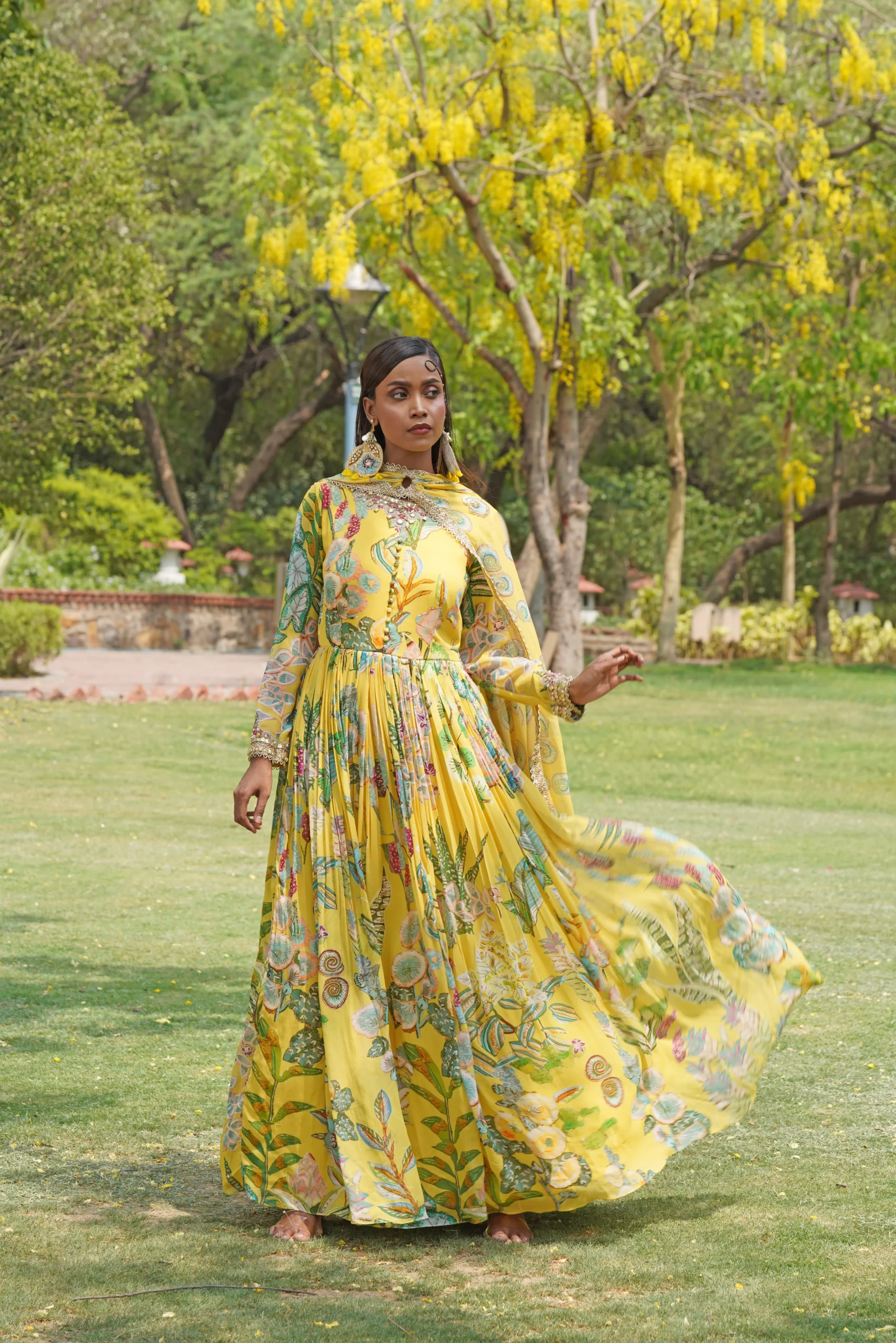 introducing a graceful Yellow full-length Anarkali gown designed for regal elegance and effortless movement. Crafted with intricate botanical and abstract prints that evoke a hand-painted finish, the silhouette features a high gathered waist and soft pleats for added volume and twirl. Full sleeves are accented with crystal and sequin-embellished cuffs for subtle sparkle, while a matching printed dupatta completes this refined, fluid ensemble—perfect for festive occasions and celebratory evenings.