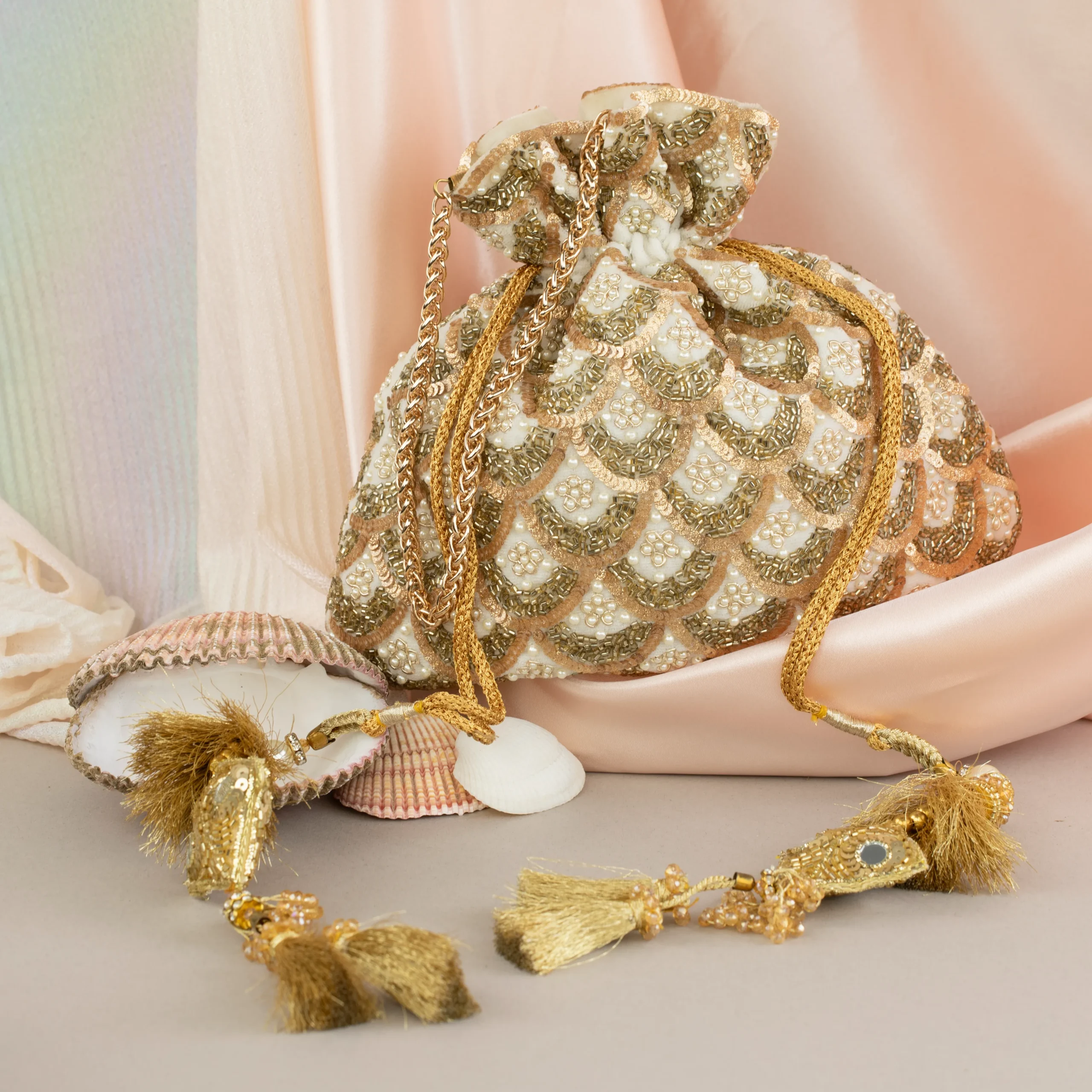 Ivory and Gold Sequins Scalloped Potli with Delicate Pearl Embellishment