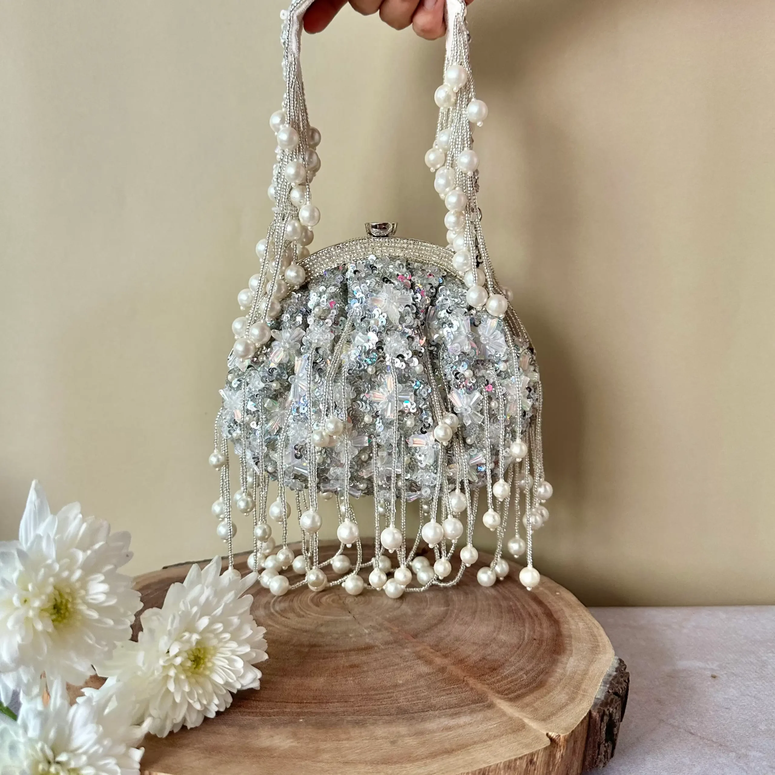 Silver White Mirror and Abla Work Cylindrical Potli with Elegant Finish