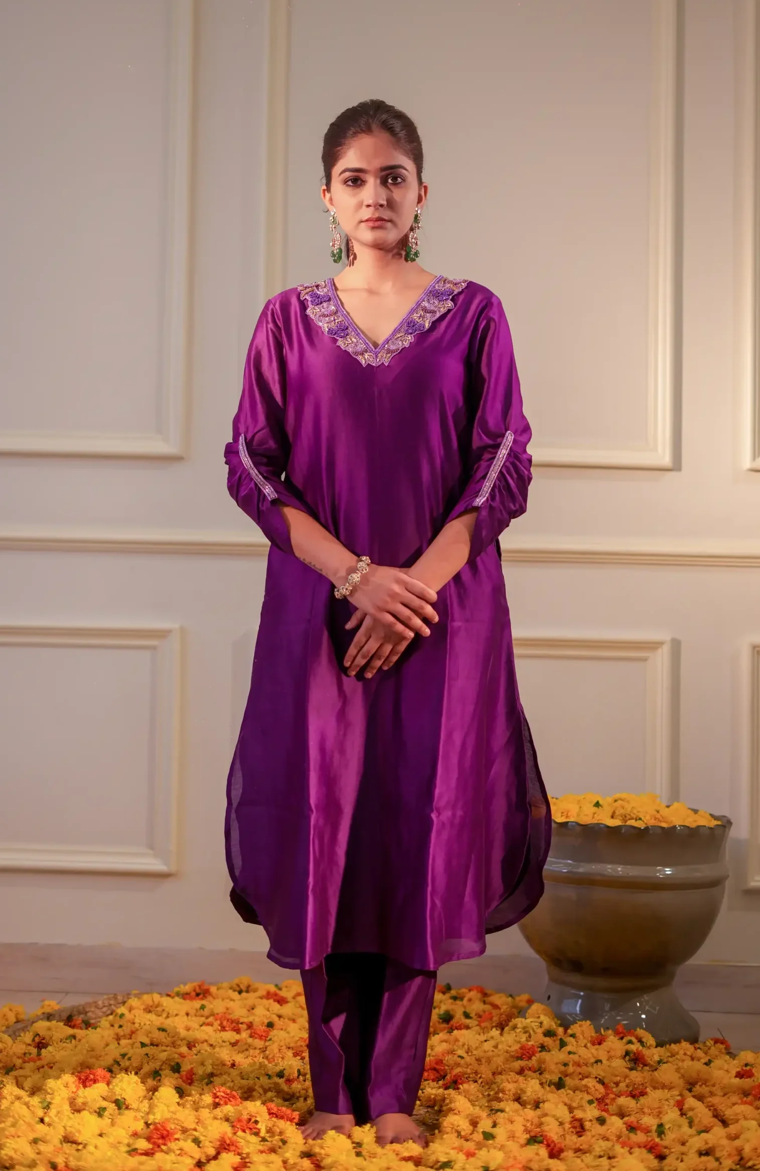 Purple Embroidered Chanderi Silk Kurta Set with Gathered Sleeves and Pants