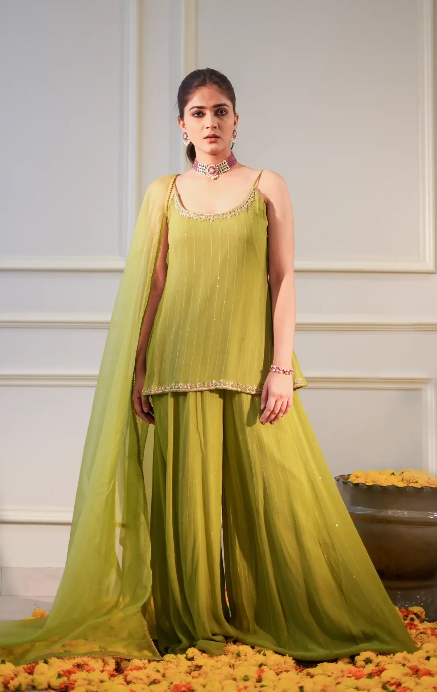 Lime Sequin Georgette Short Kurti Set with Garara and Organza Dupatta