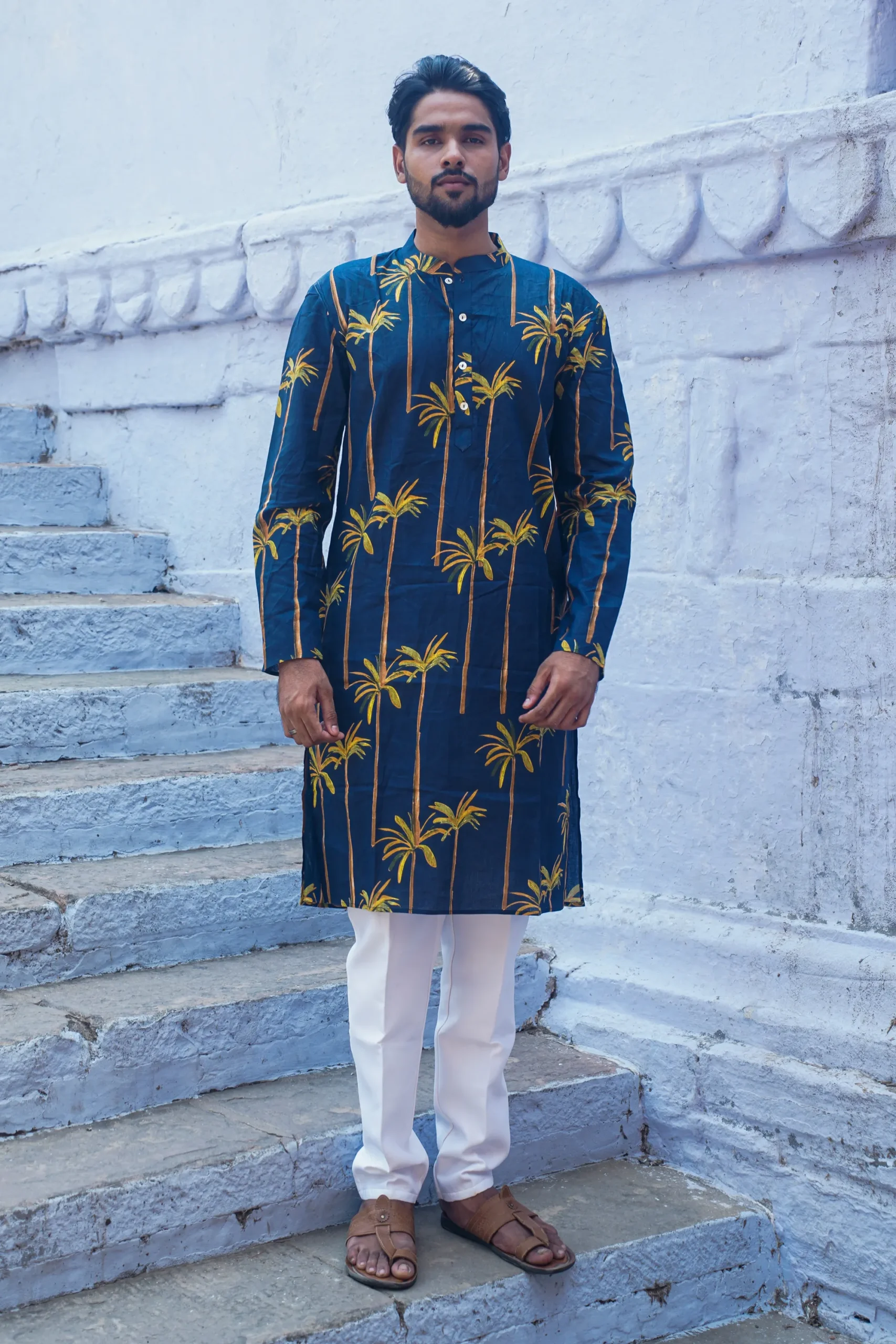 Navy Blue Paradise Floral Printed Cotton Kurta with Mandarin Collar & Side Pockets