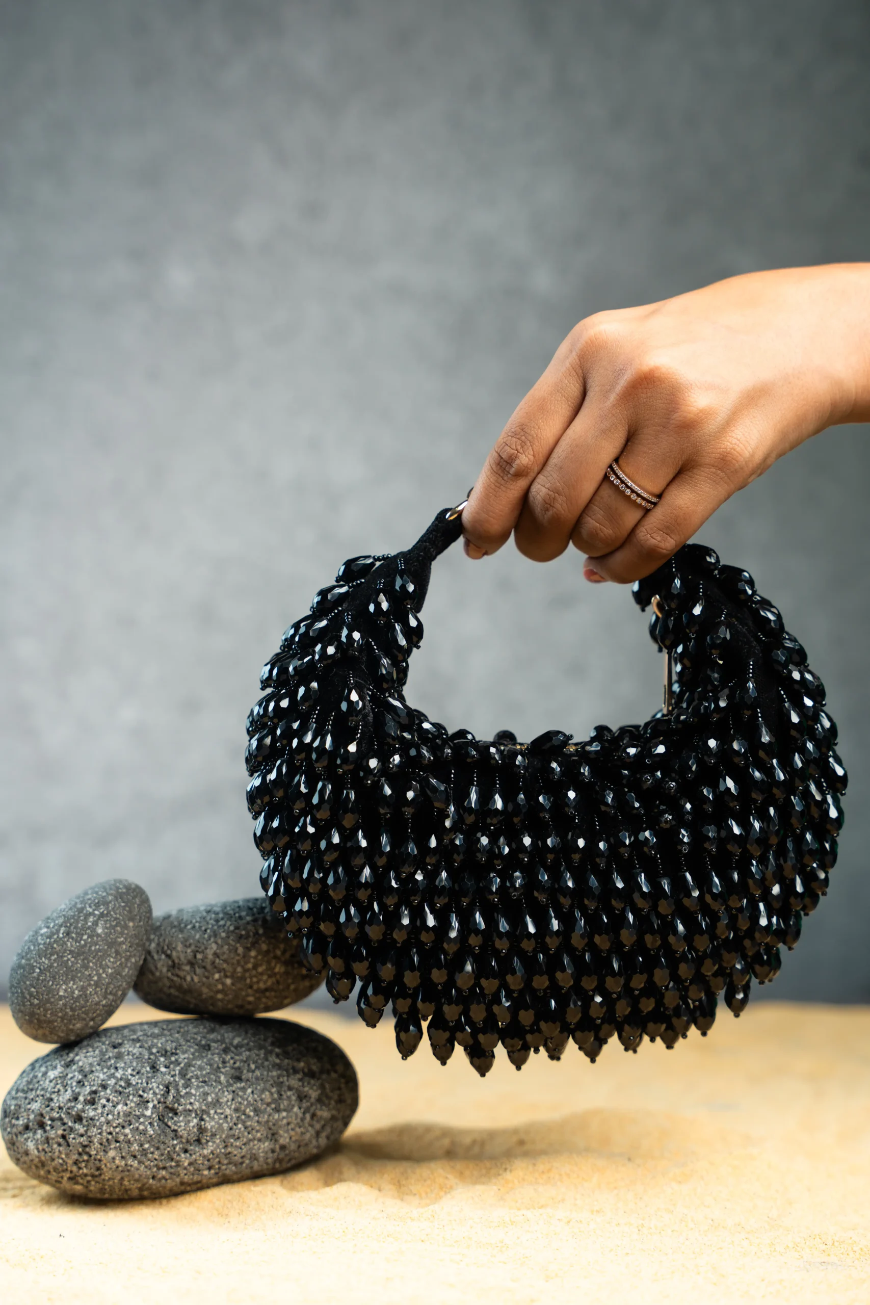 Pristine Sailor Noir Black Beaded Clutch with Gold Hardware and Luxe Finish