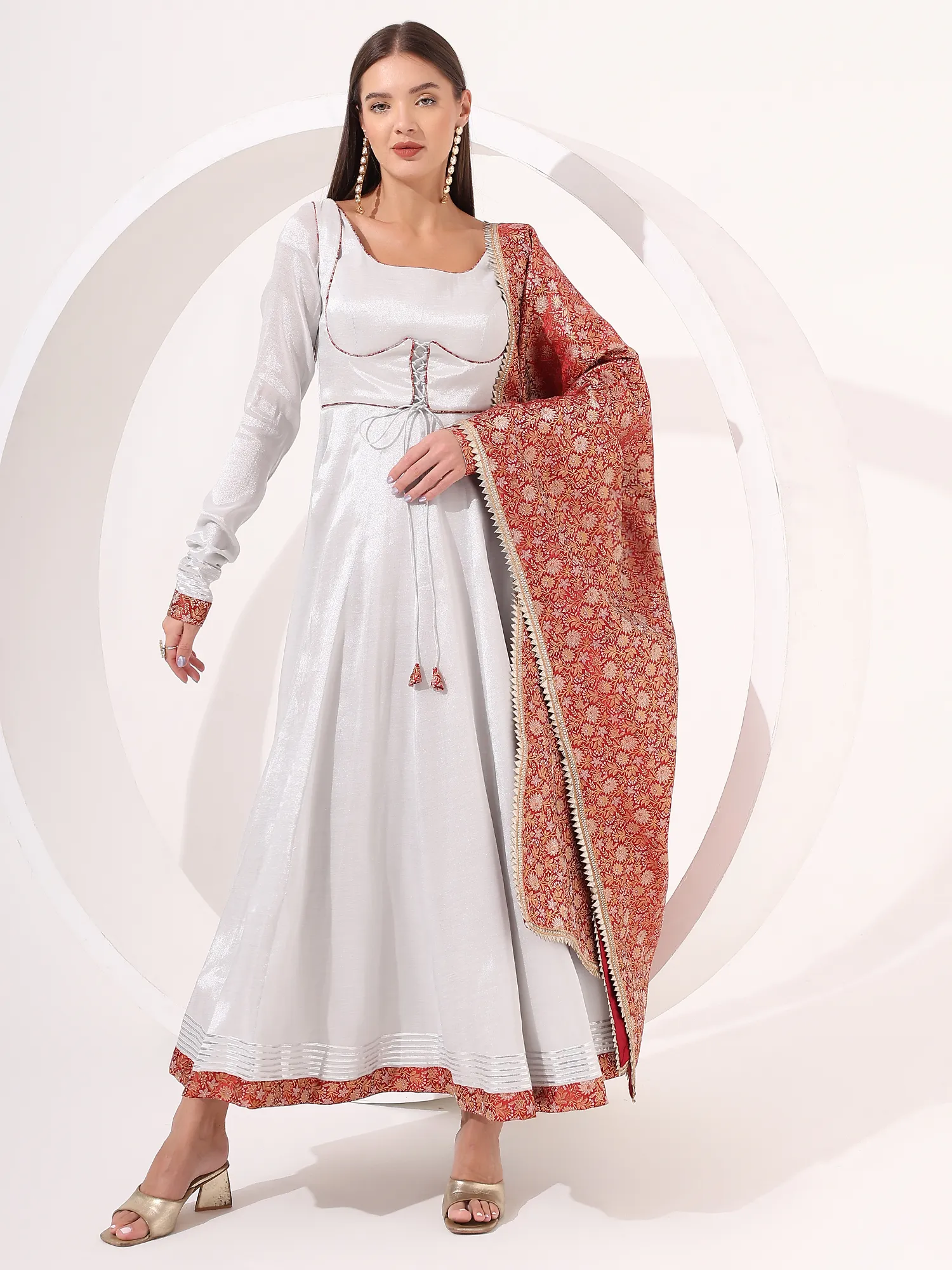 Silver Tissue Anarkali with Brocade Dupatta & Madhubala Neck for Bridal Wear