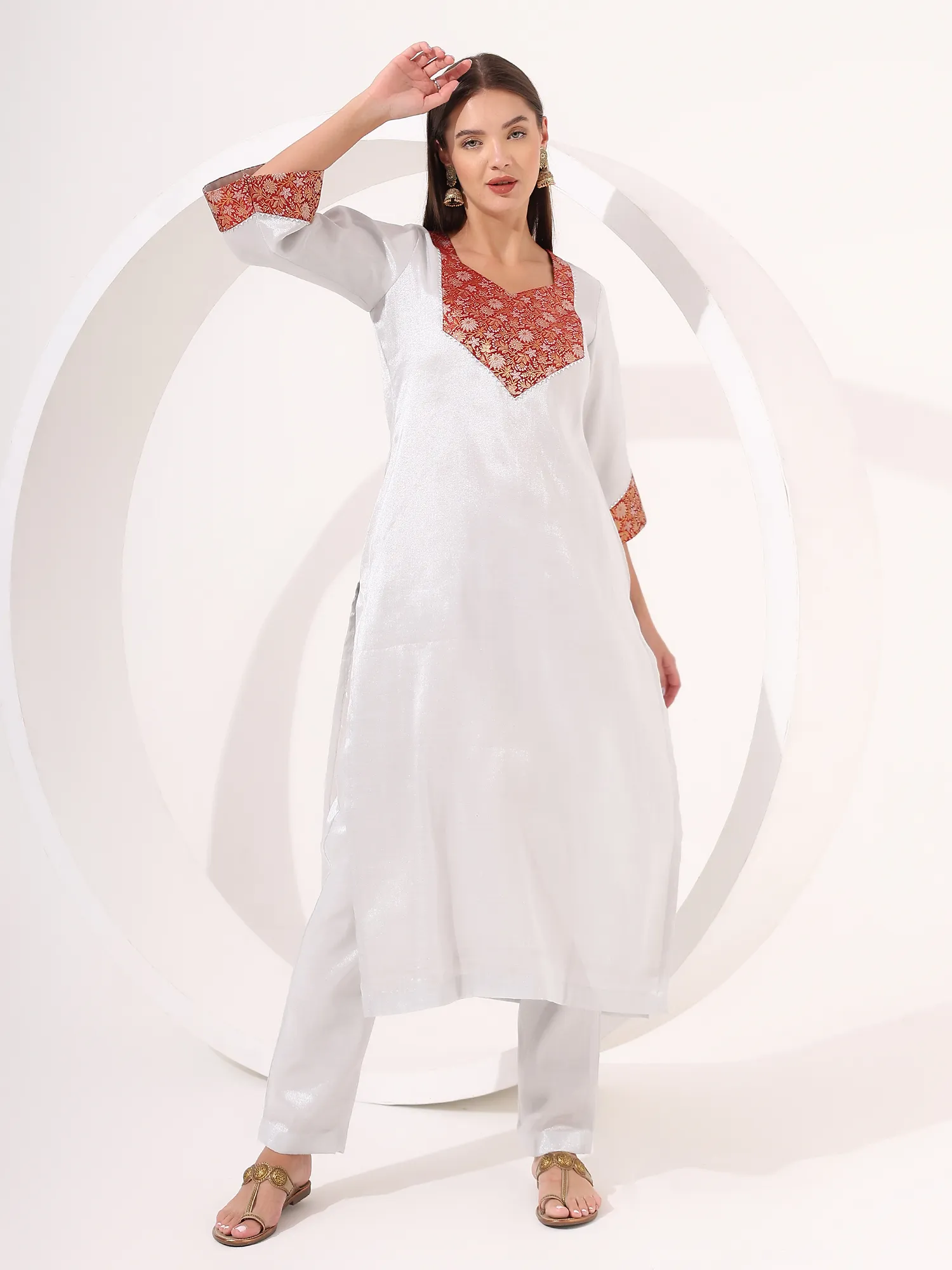 Silver Tissue Straight Kurta Set with Magenta Brocade V-Neck for Festive Wear
