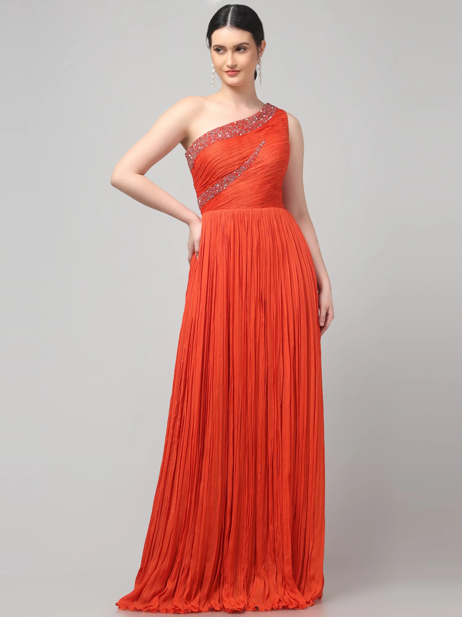 Orange One-Shoulder Pleated Evening Gown with Hand Embellished Neckline