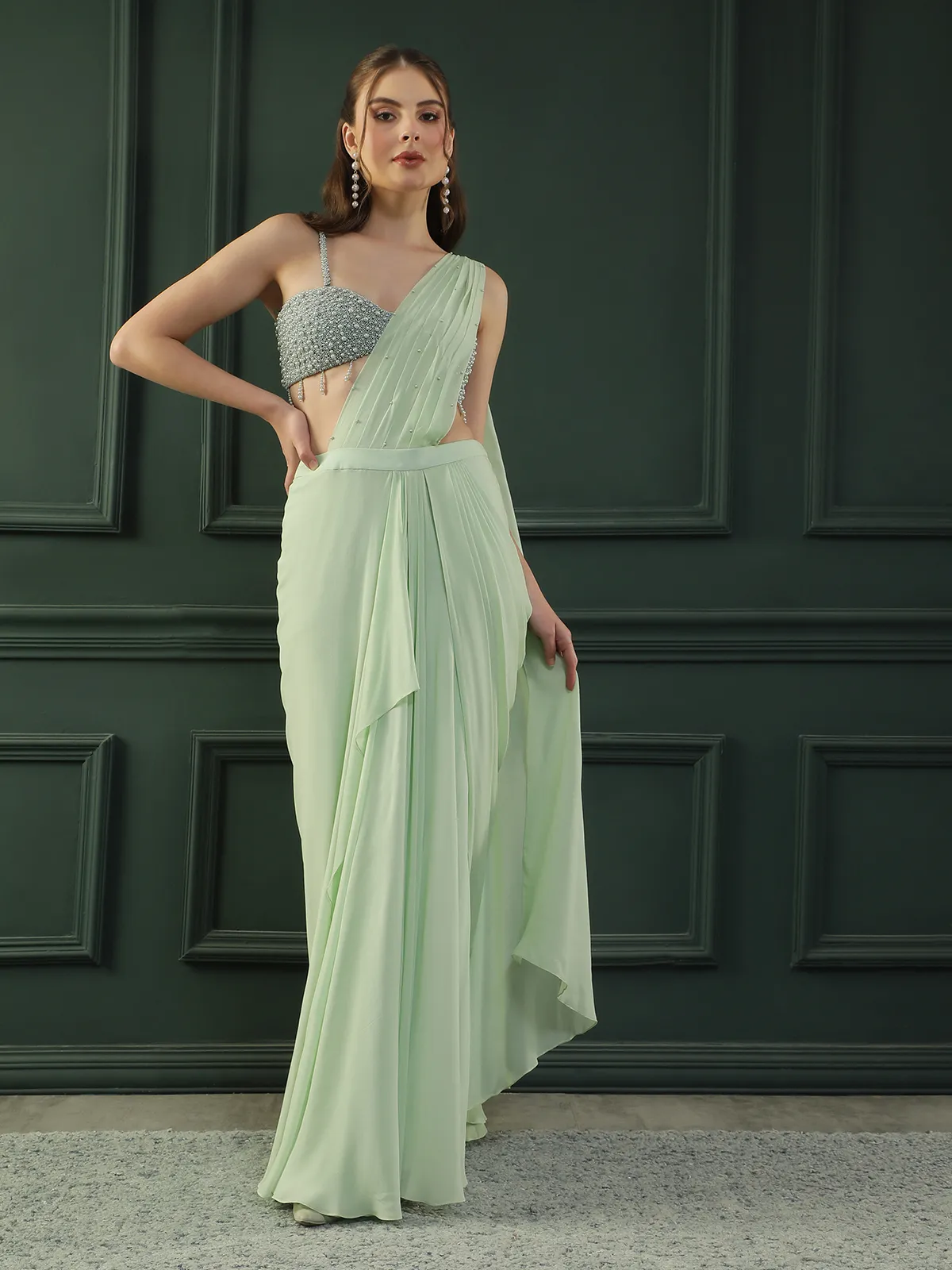 Mint Green Pre-Draped Georgette Saree with Pearl Embellished Blouse