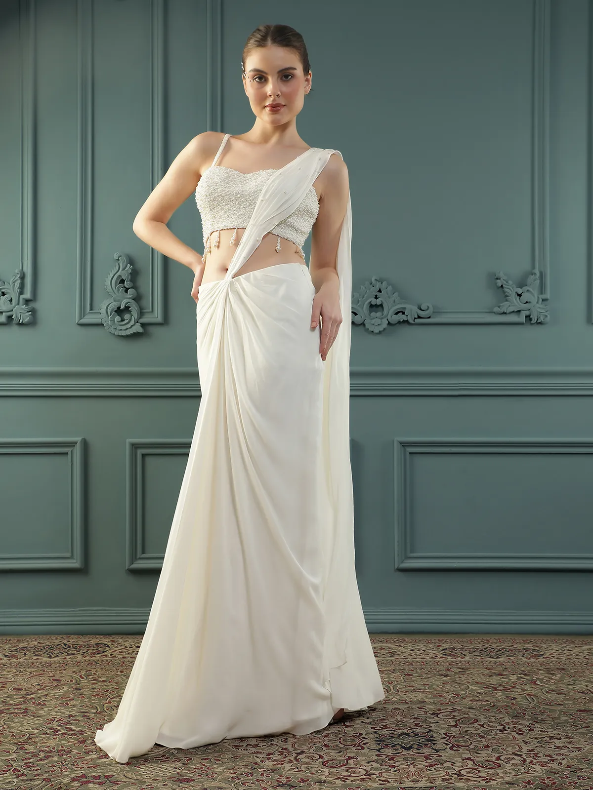Pearl White Pre-Draped Georgette Saree with Pearl Embellished Blouse