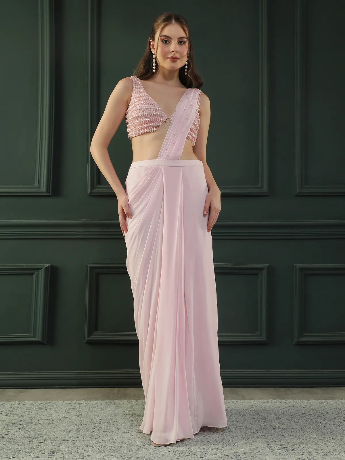 Powder Pink Pre-Draped Georgette Saree with Hand Embellished Pearl Blouse