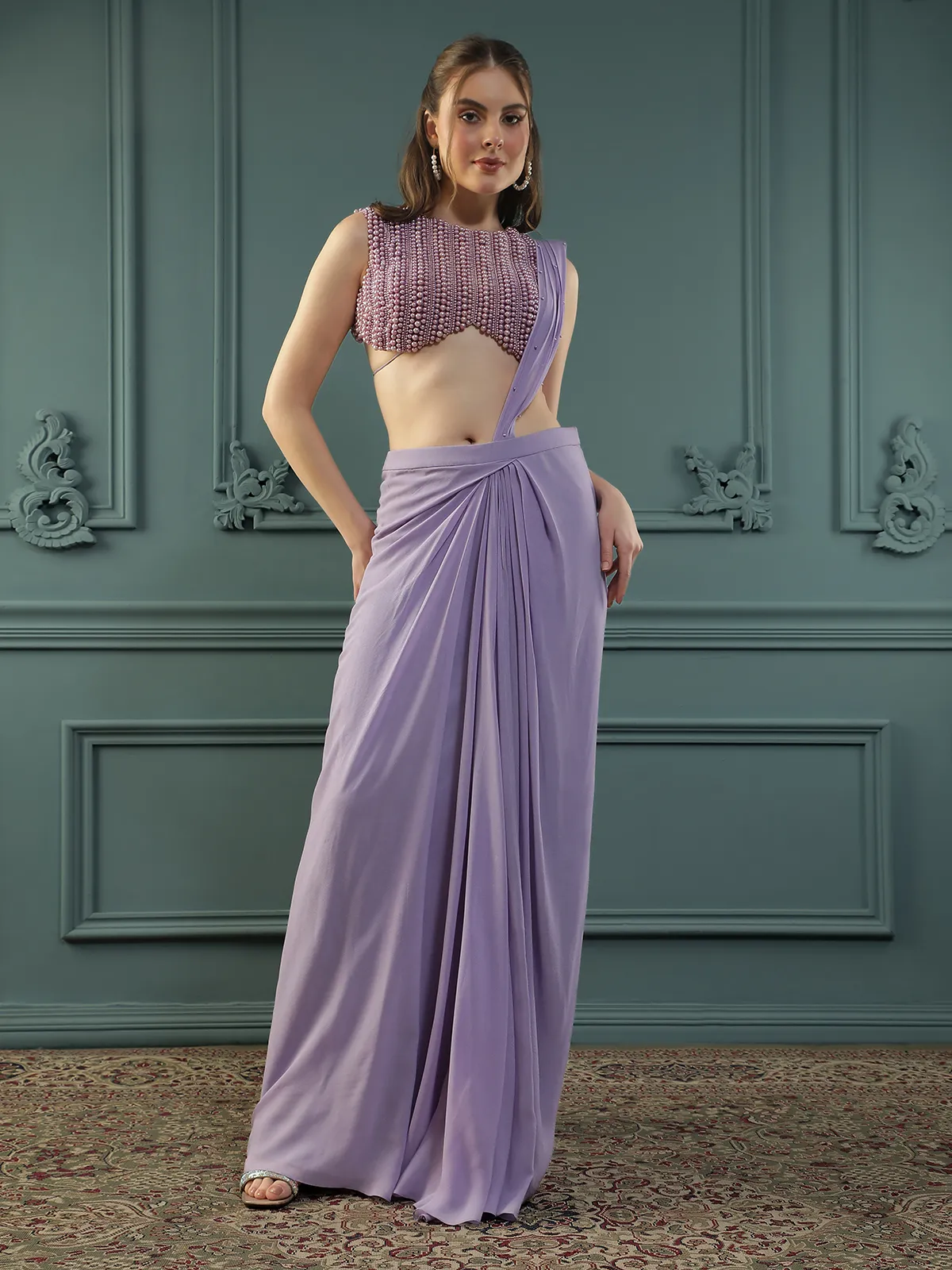Soft Purple Pre-Draped Georgette Saree with Hand Embellished Blouse