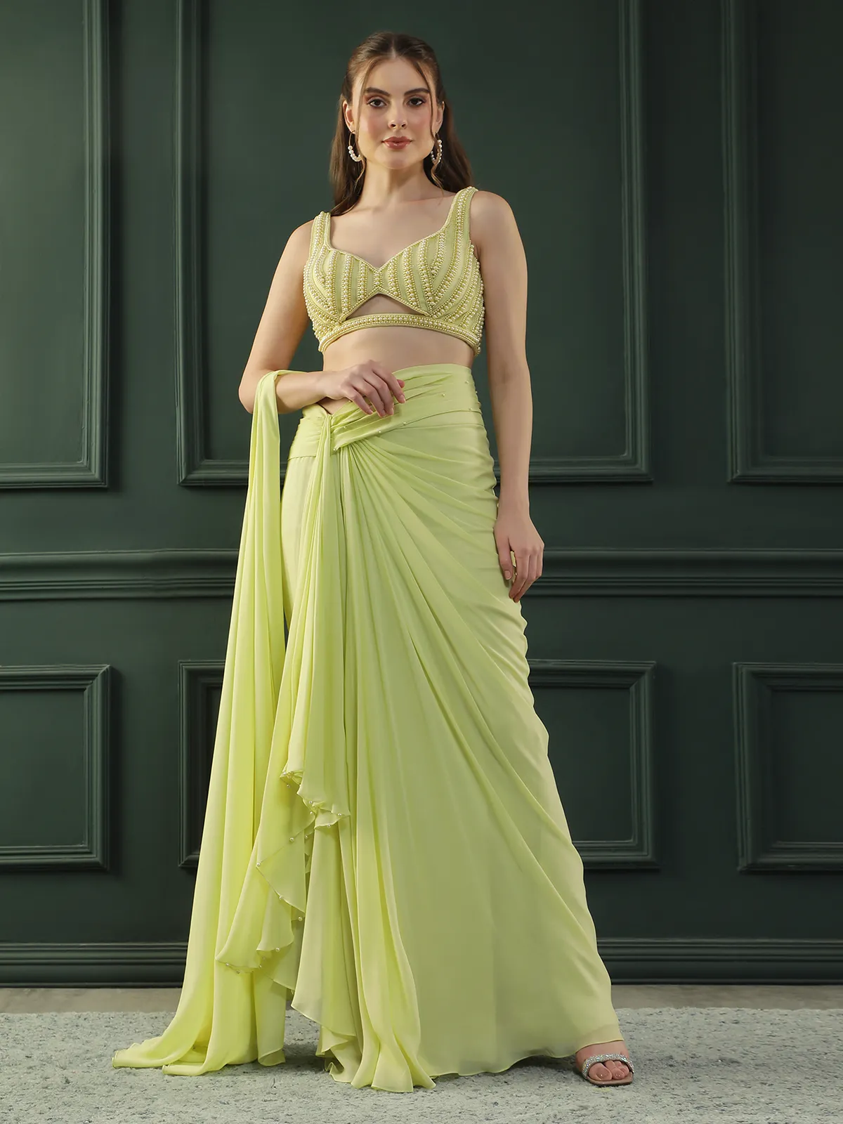 Lime Green Pre-Draped Georgette Saree with Hand Embellished Blouse