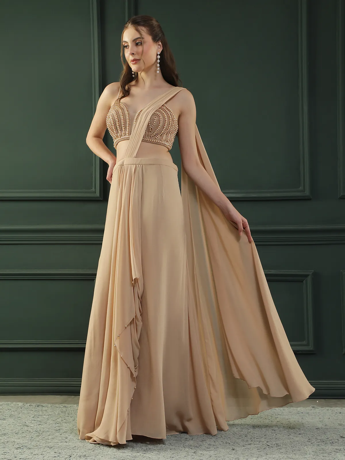Tan Brown Pre-Draped Georgette Saree with Hand Embellished Pearl Blouse