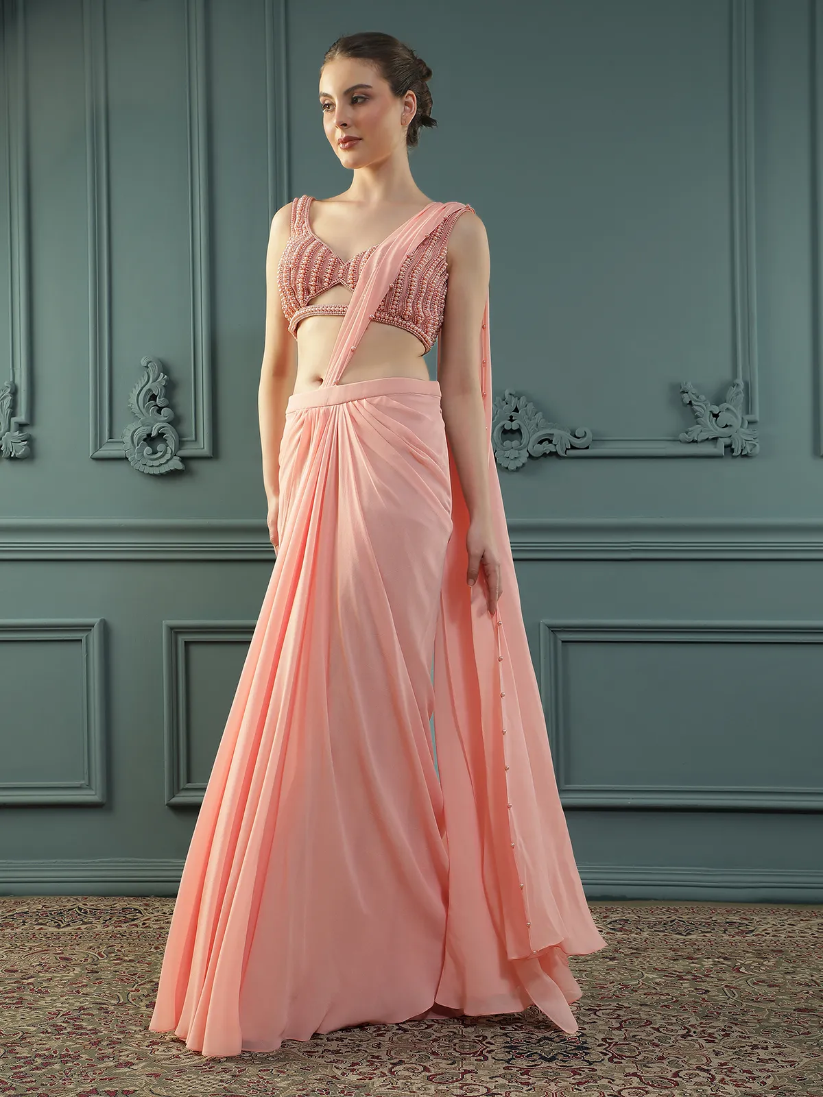 Peach Pre-Draped Georgette Saree with Hand Embellished Pearl Blouse