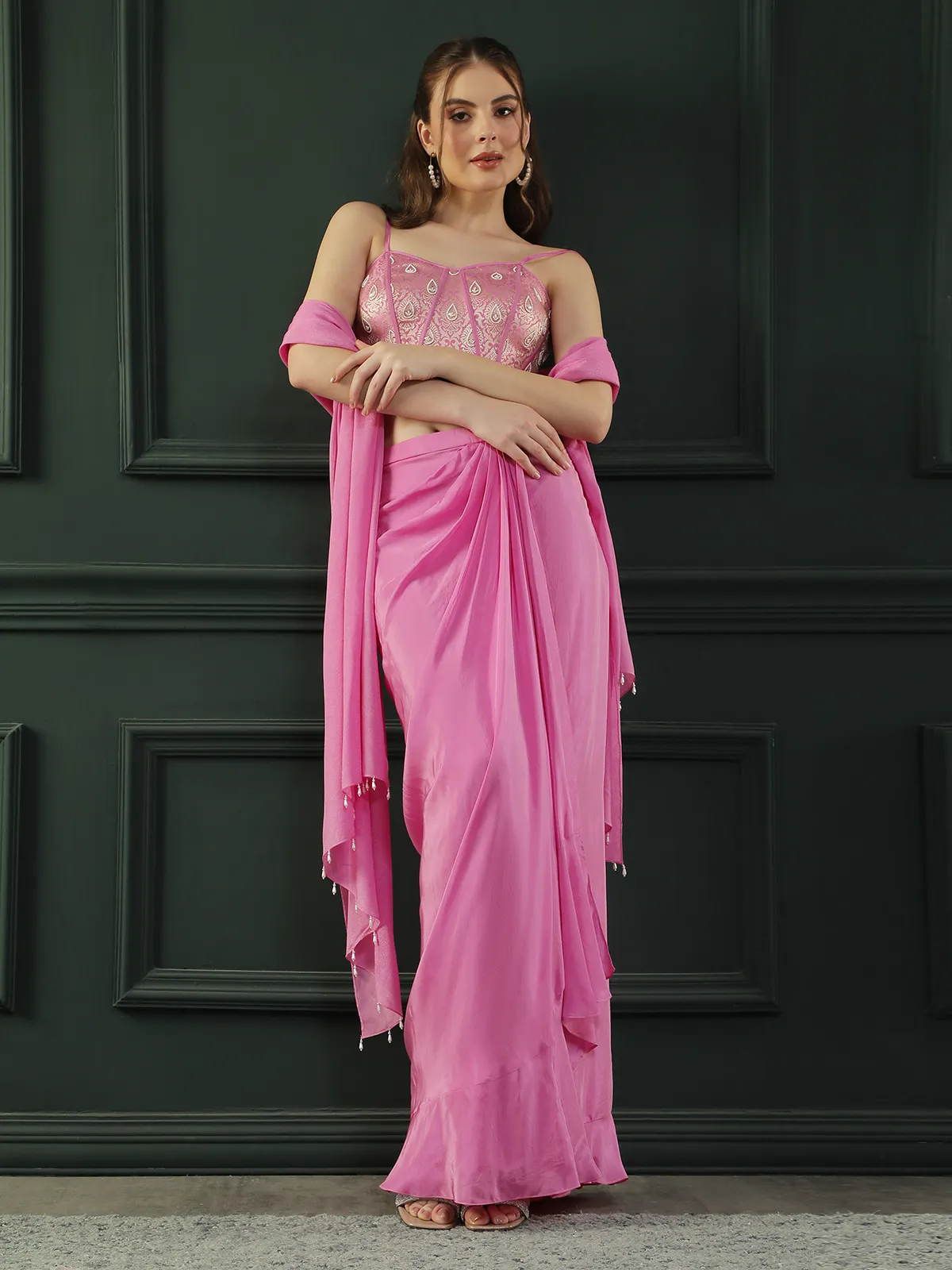 Fuchsia Pink Crepe Drape Skirt Set with Brocade Corset and Dupatta