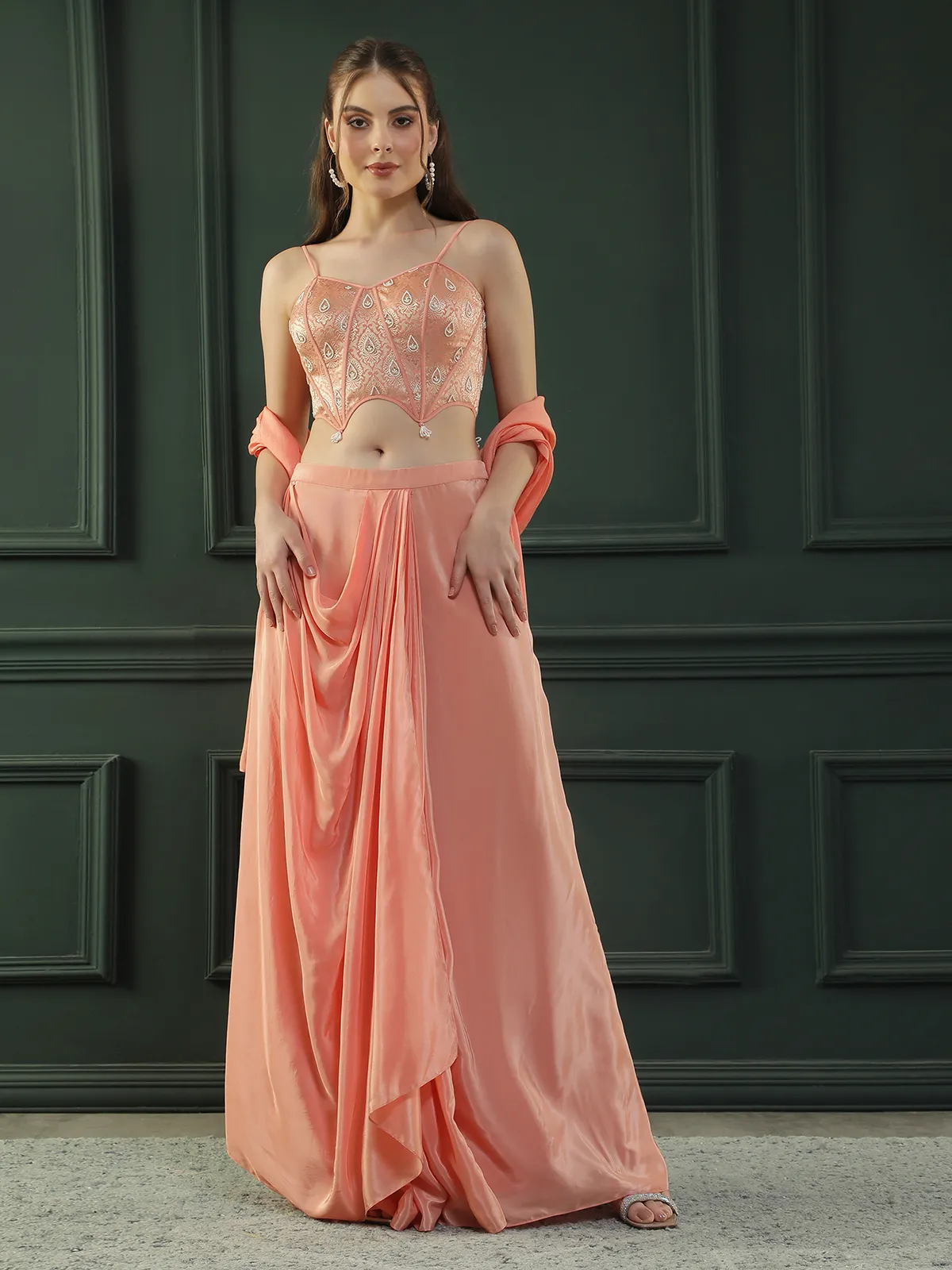 Peach Drape Skirt Set with Brocade Corset and Latkan Dupatta