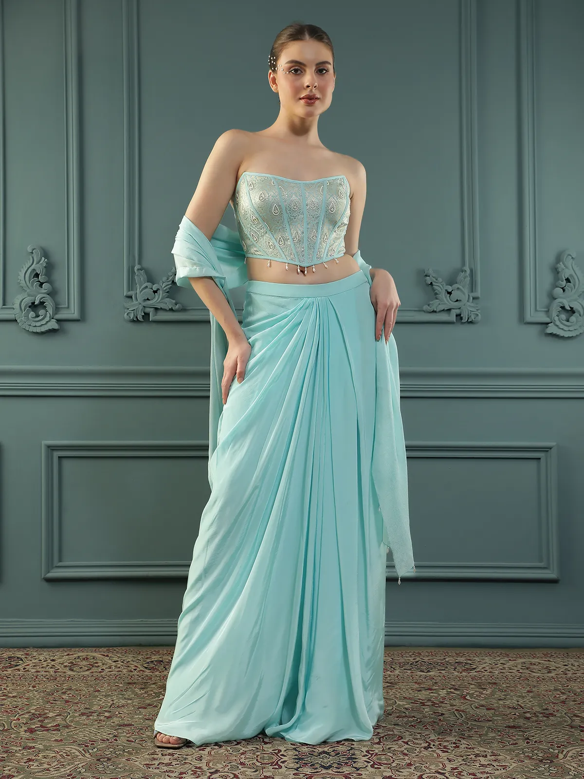 Ice Blue Drape Skirt Set with Brocade Corset and Latkan Dupatta