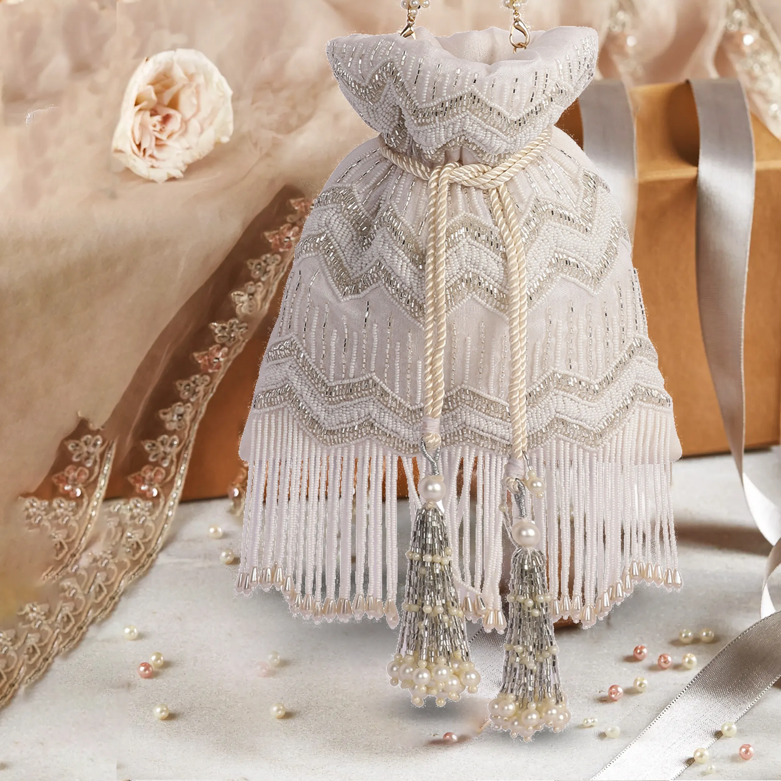 Gulaab Hand-Embroidered Cutdana & Pearl Silk Potli Bag – Off White