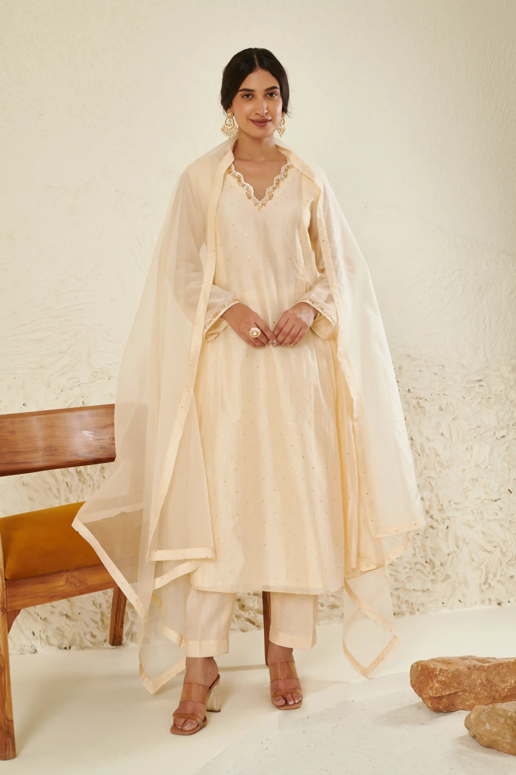 All-Over Mukesh Work Chanderi Pleated Kurta Set with Organza Dupatta