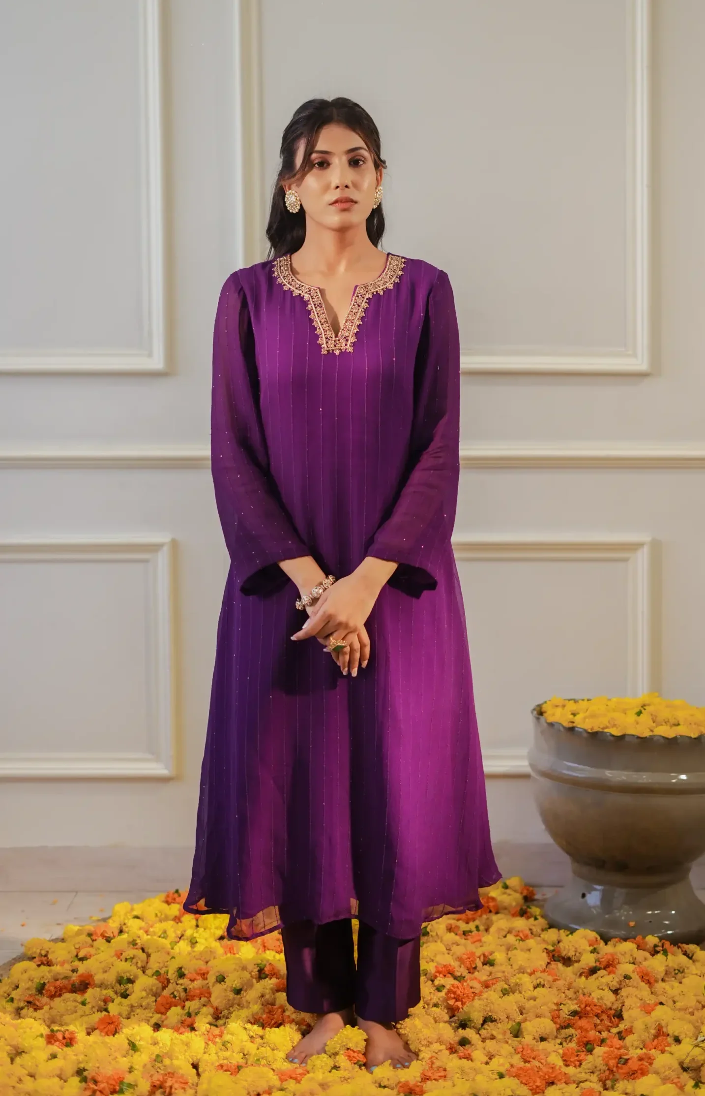 Purple Sequin Georgette A-Line Kurta Set with Chanderi Silk Straight Pants