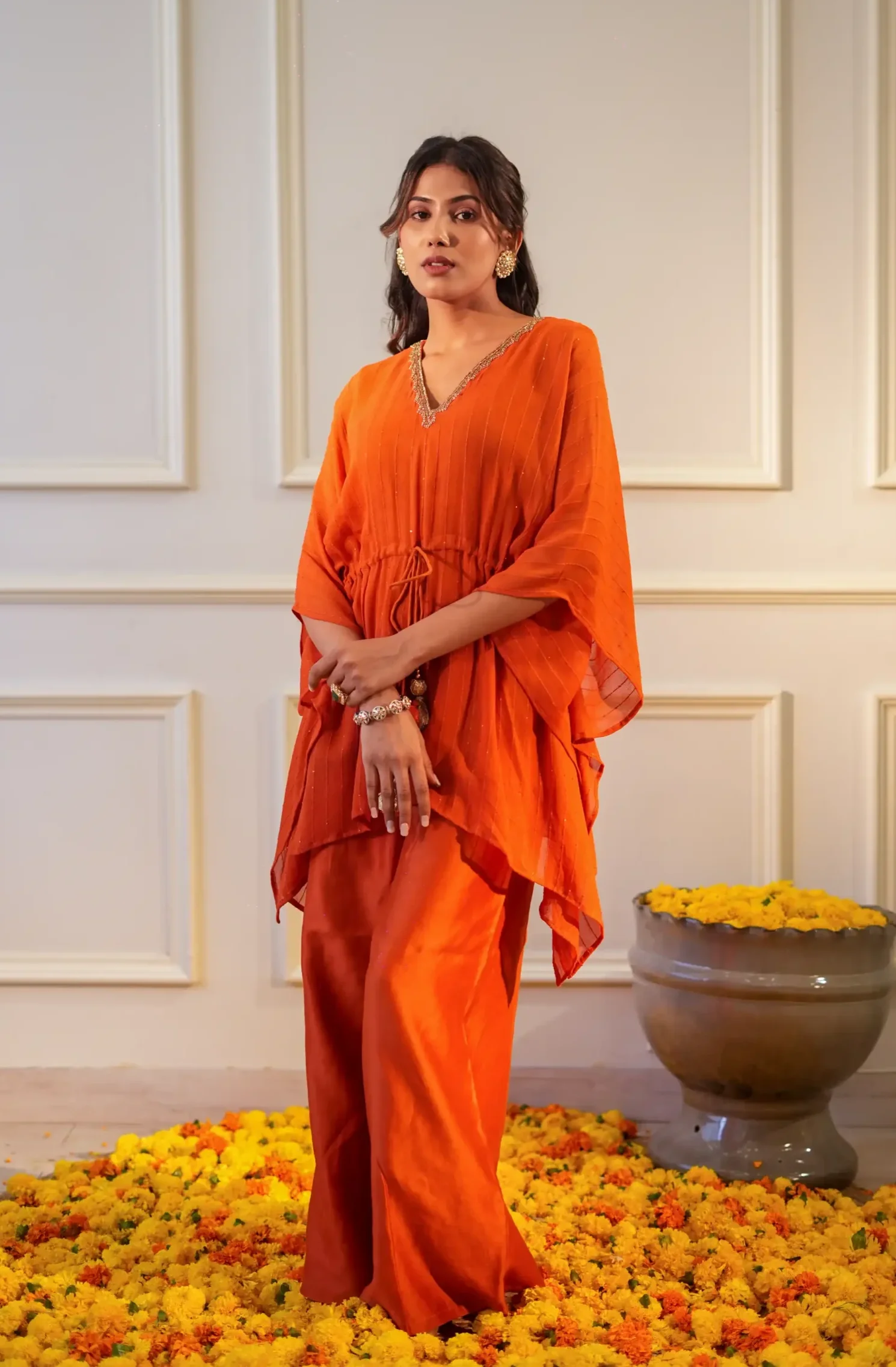 Orange Sequin Georgette Kaftan Set with Chanderi Silk Flared Pants for Women