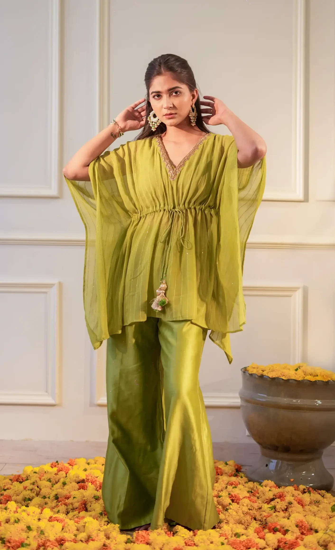 Lime Green Sequin Georgette Kaftan Set with Chanderi Silk Flared Pants