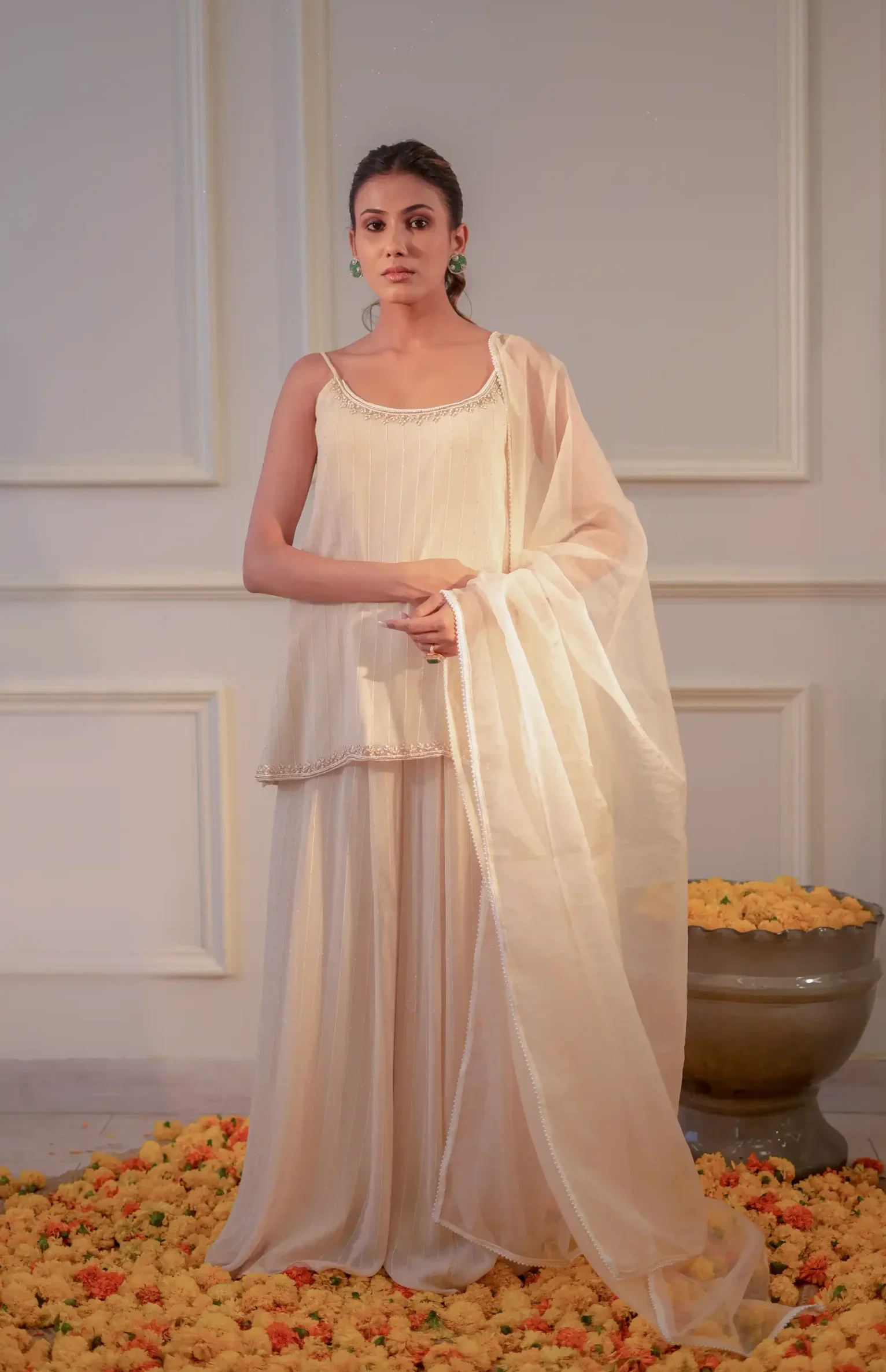 Ivory Sequin Georgette Short Kurti Set with Garara and Organza Dupatta