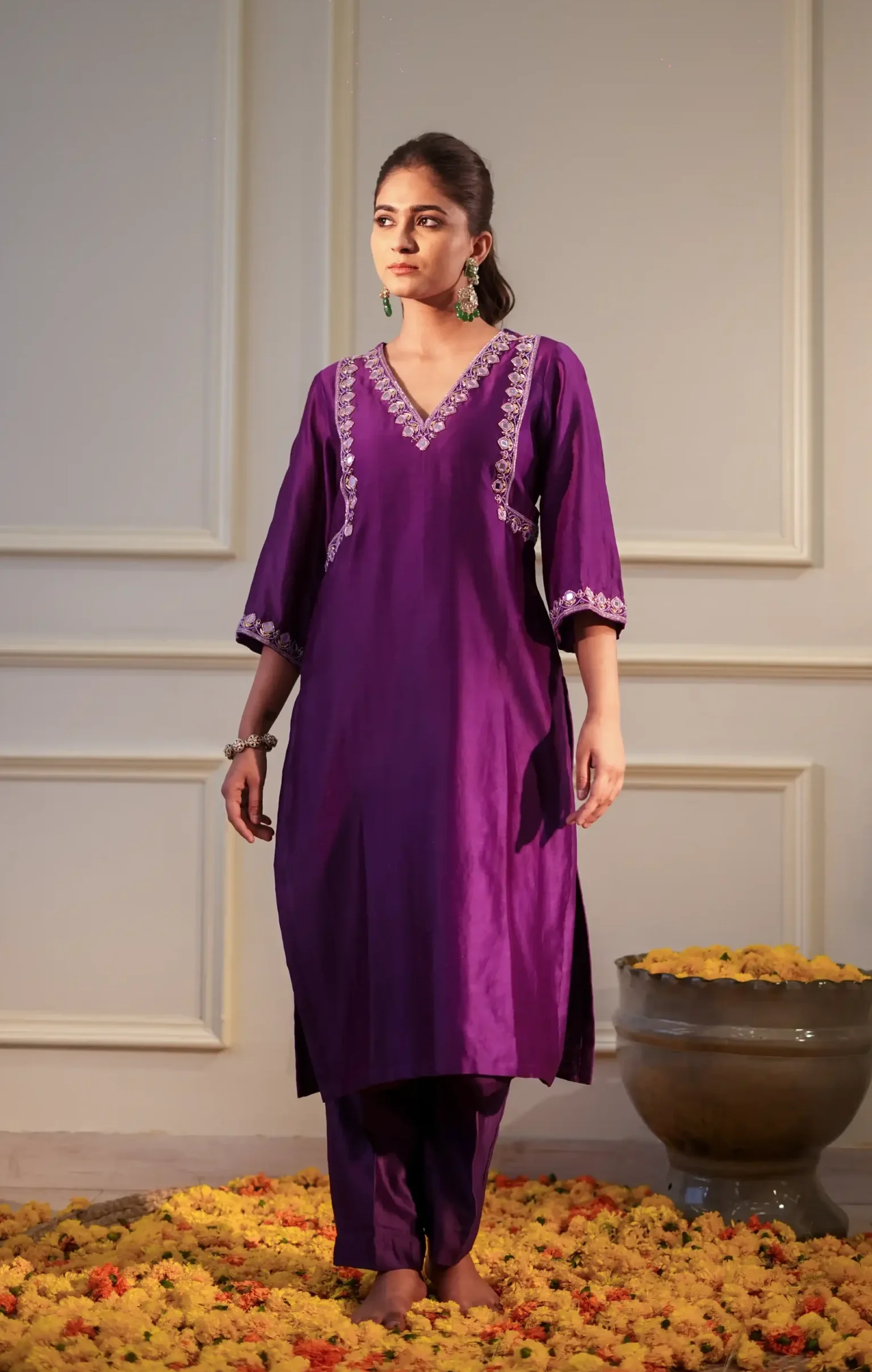 Purple Mirror Work Hand Embroidered Chanderi Silk Kurta Set with Pants for Women