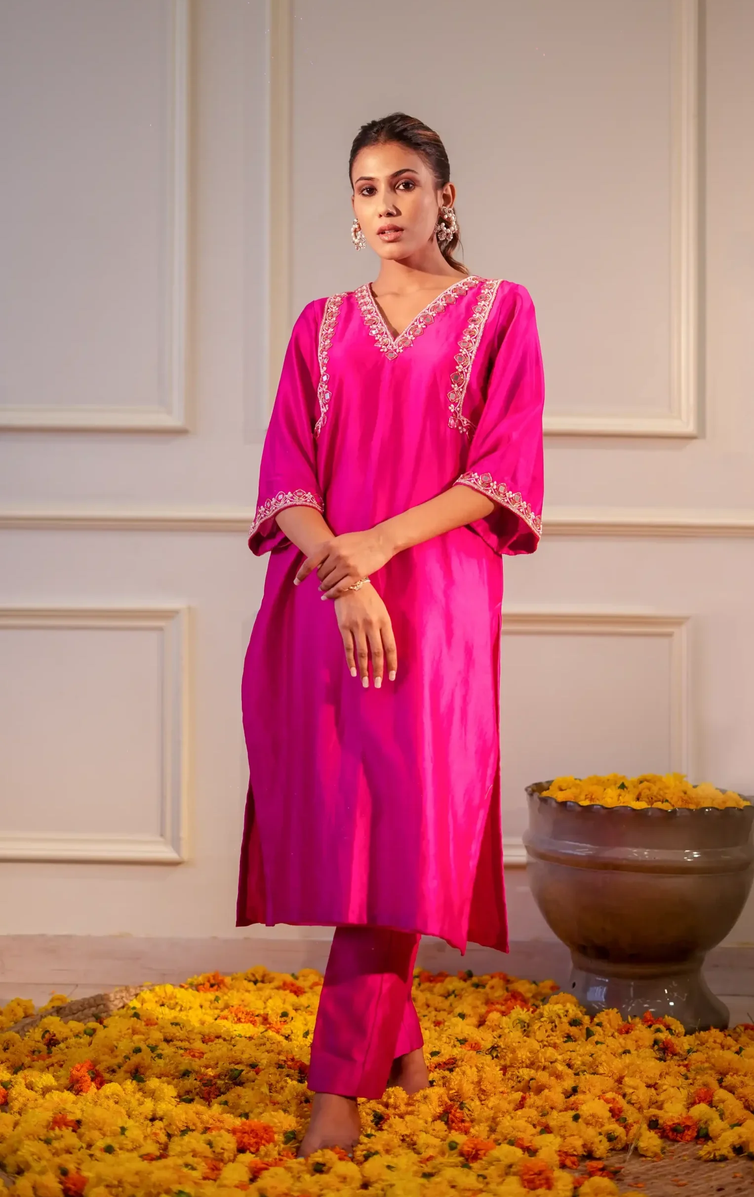 Pink Mirror Work Hand Embroidered Chanderi Silk Kurta Set with Straight Pants