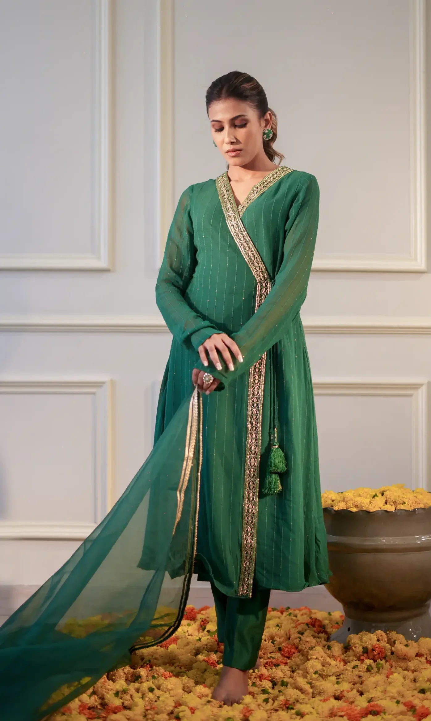 Green Sequin Georgette Angrakha Kurta Set with Chanderi Pants and Dupatta