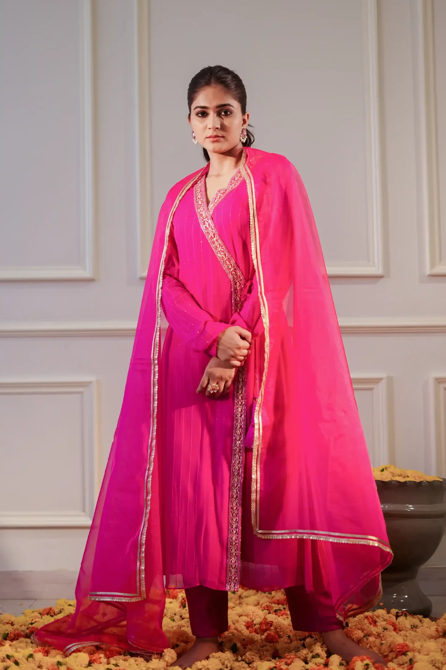 Pink Sequin Georgette Angrakha Kurta Set with Chanderi Pants and Dupatta