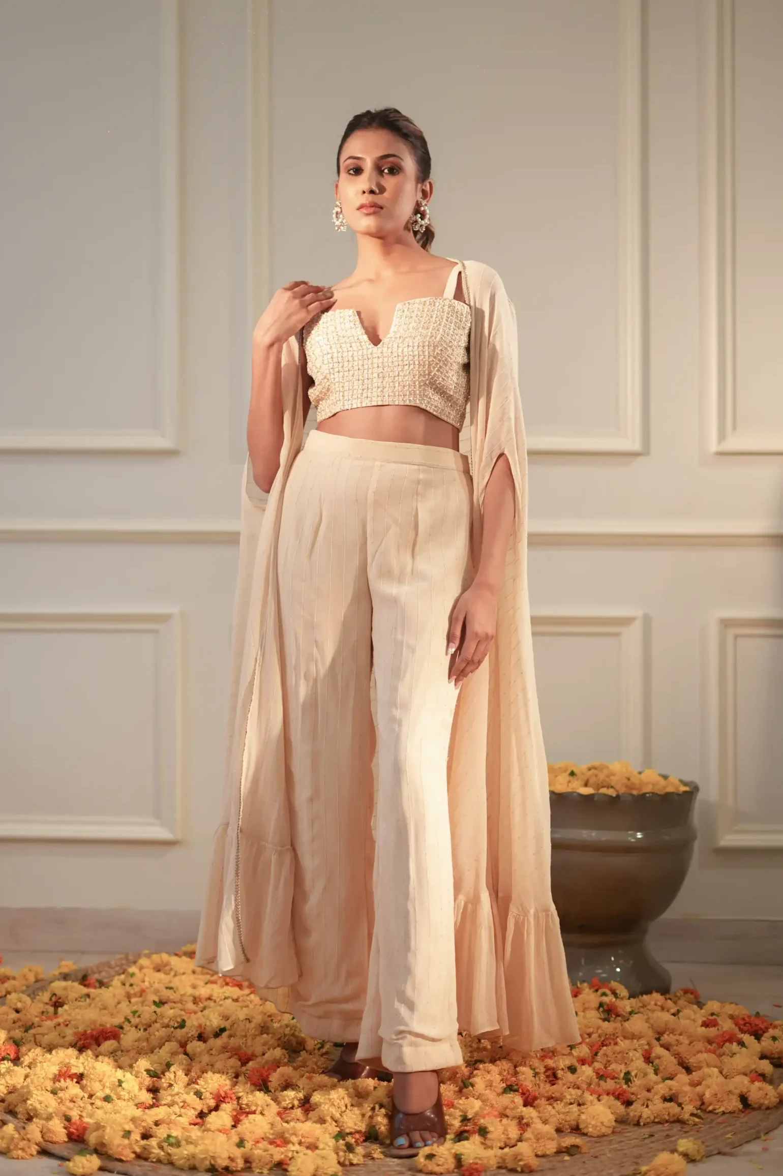 Ivory Embroidered Silk Blouse Set with Sequin Georgette Pants and Cape