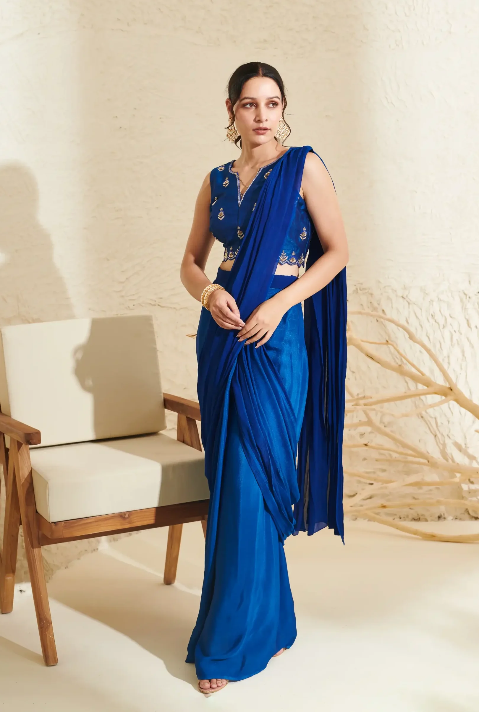 Royal Blue Pleated Saree with Hand Embroidered Scalloped Blouse