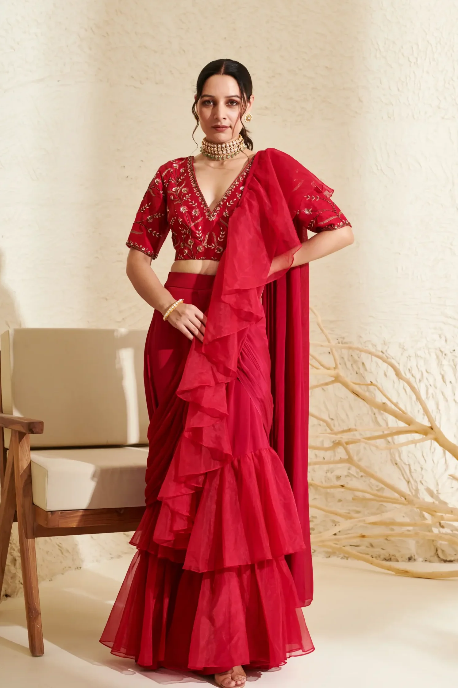 Magenta Organza Ruffle Saree with Hand Embroidered Blouse