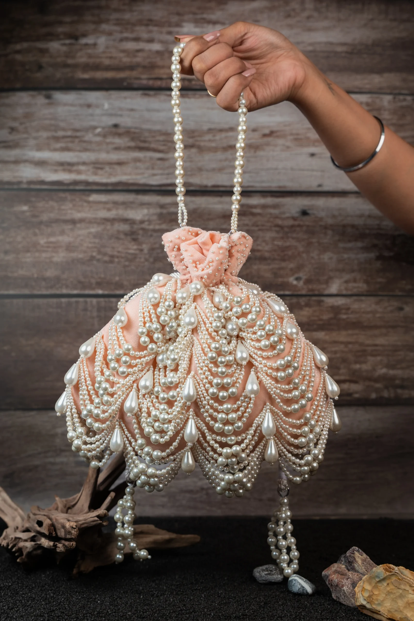 Blush Pink Pearl Velvet Potli Bag with Layered Pearls and Tassel Drawstring